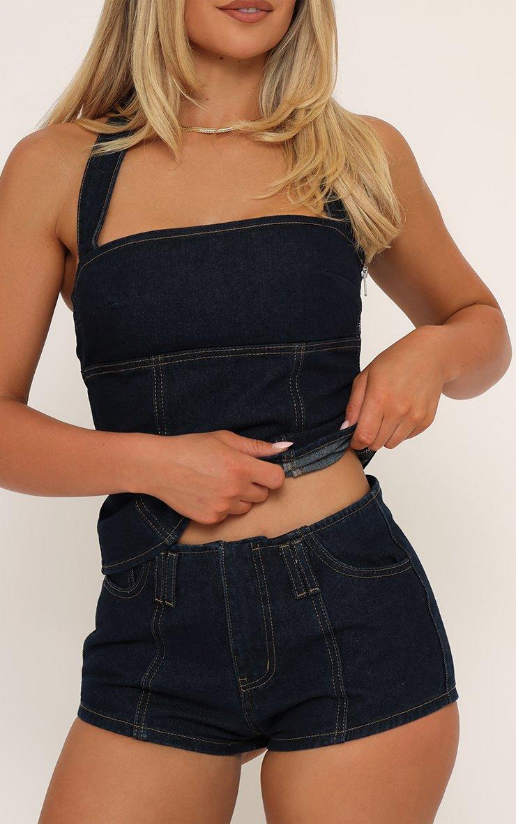 Mid Rise Wrapover Skort In Indigo Blue Denim