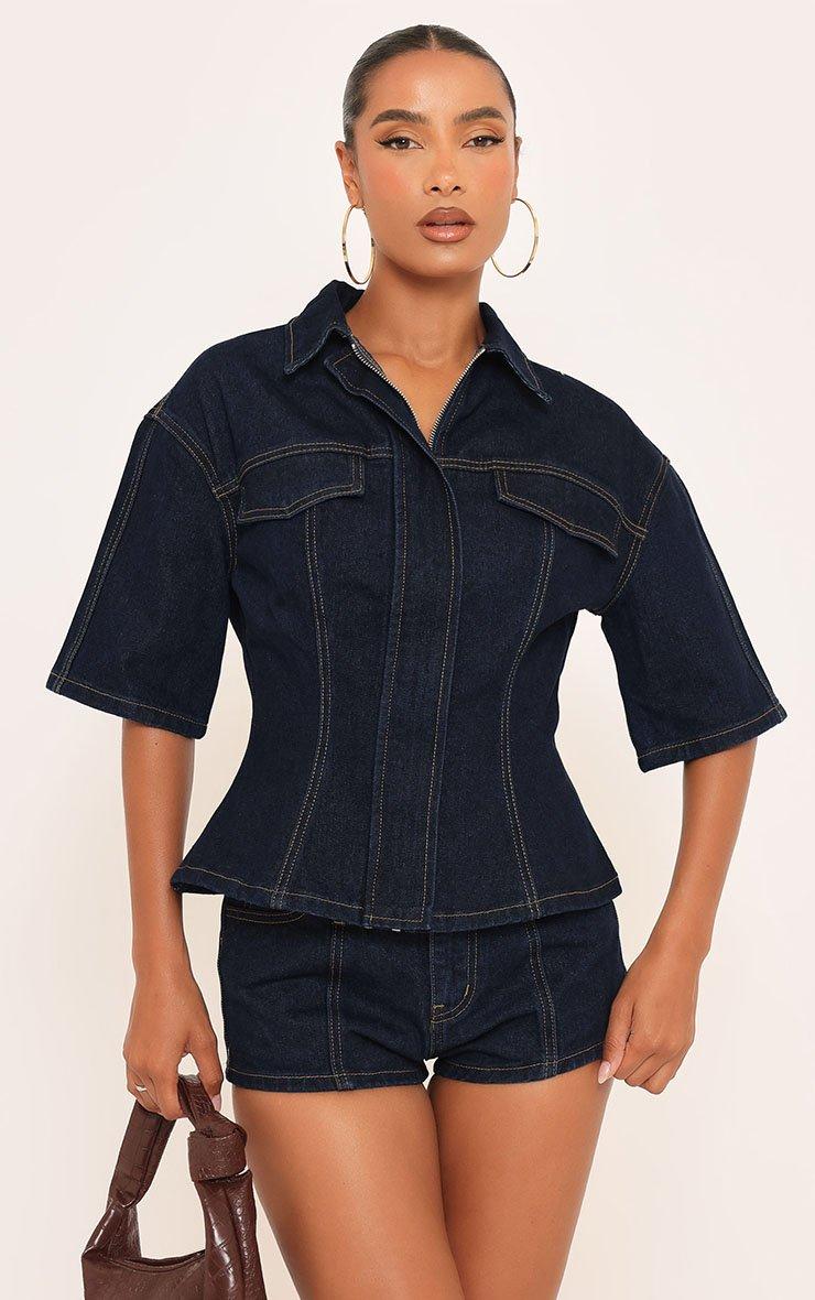 Short Sleeve Collared Pocked Detail Top In Indigo Blue Denim