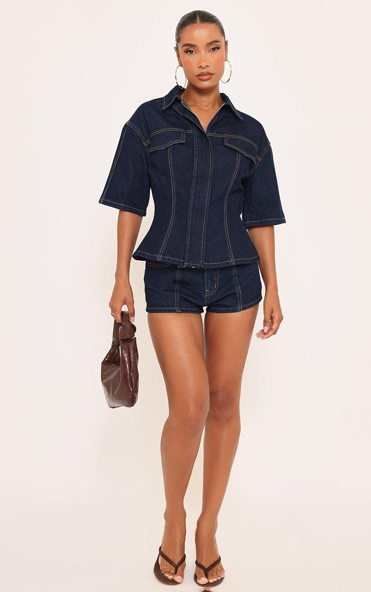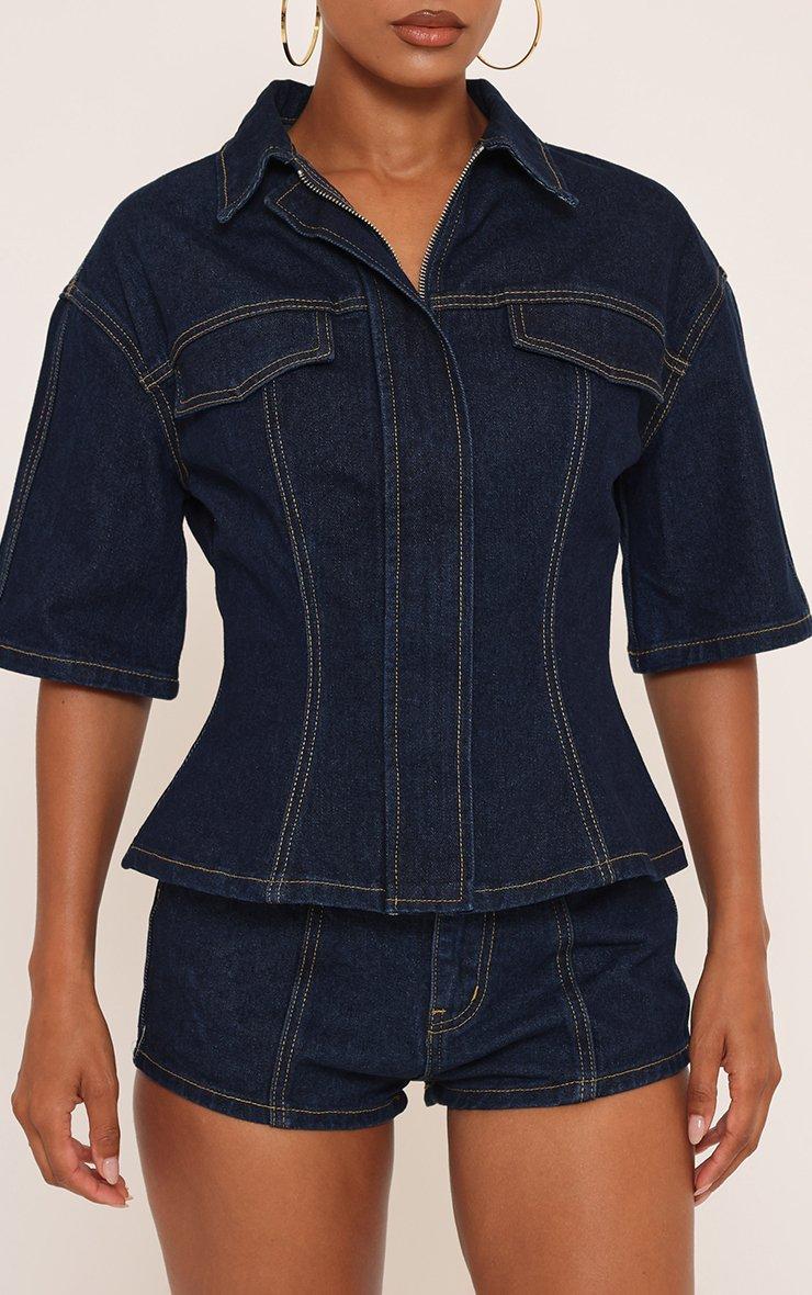 Short Sleeve Cinched Waist Detail Collared Top In Indigo Blue Denim