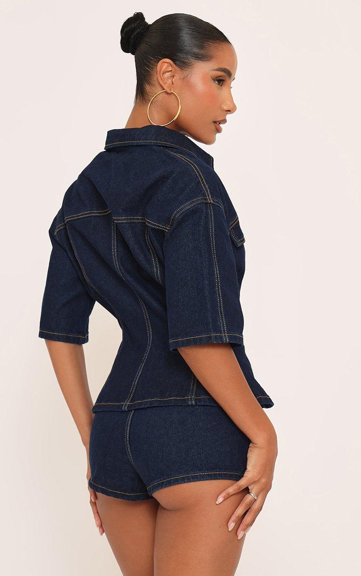 Long Sleeve Button Down Cinched Waist Detail Crop Jacket In Indigo Blue Denim
