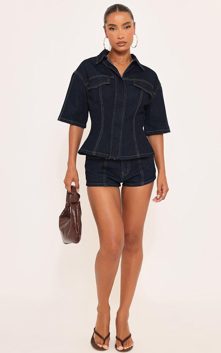Short Sleeve Cinched Waist Detail Collared Top In Indigo Denim