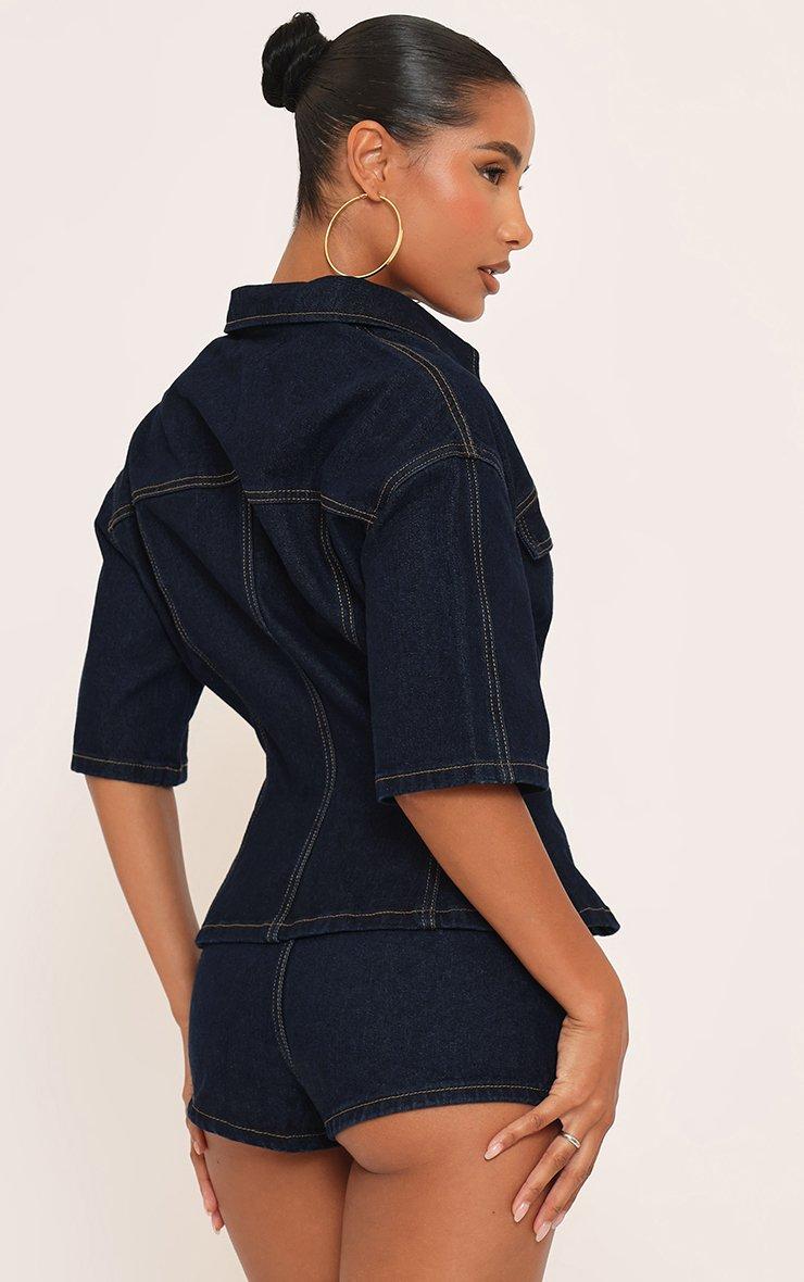 Short Sleeve Collared Pocked Detail Top In Indigo Blue Denim