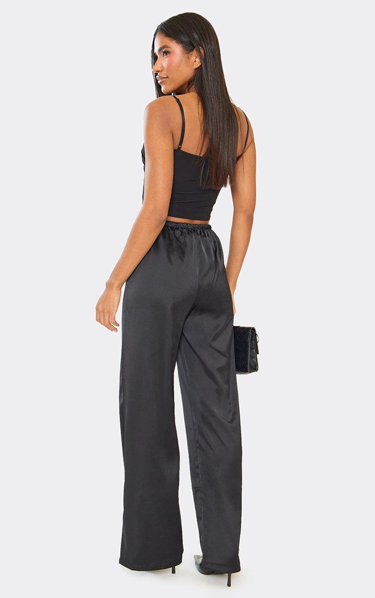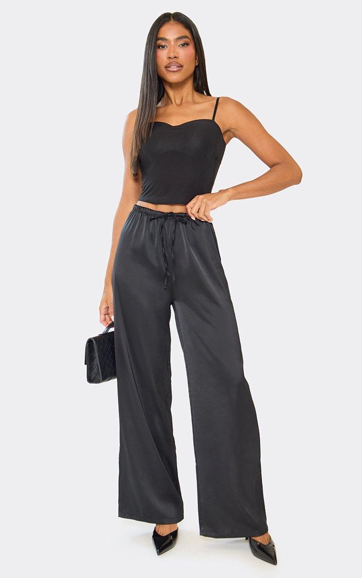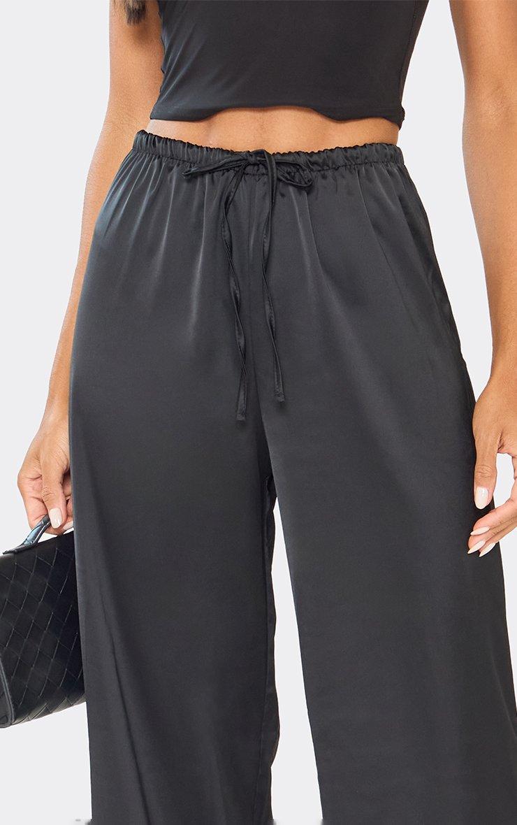 Mid Rise Tie Waist Detail Wide Leg Trousers In Black Satin