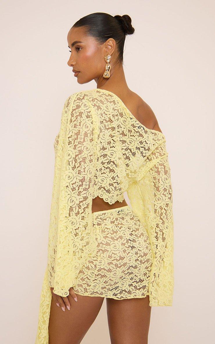 Off The Shoulder Flared Sleeve Asymmetric Top In Yellow Lace
