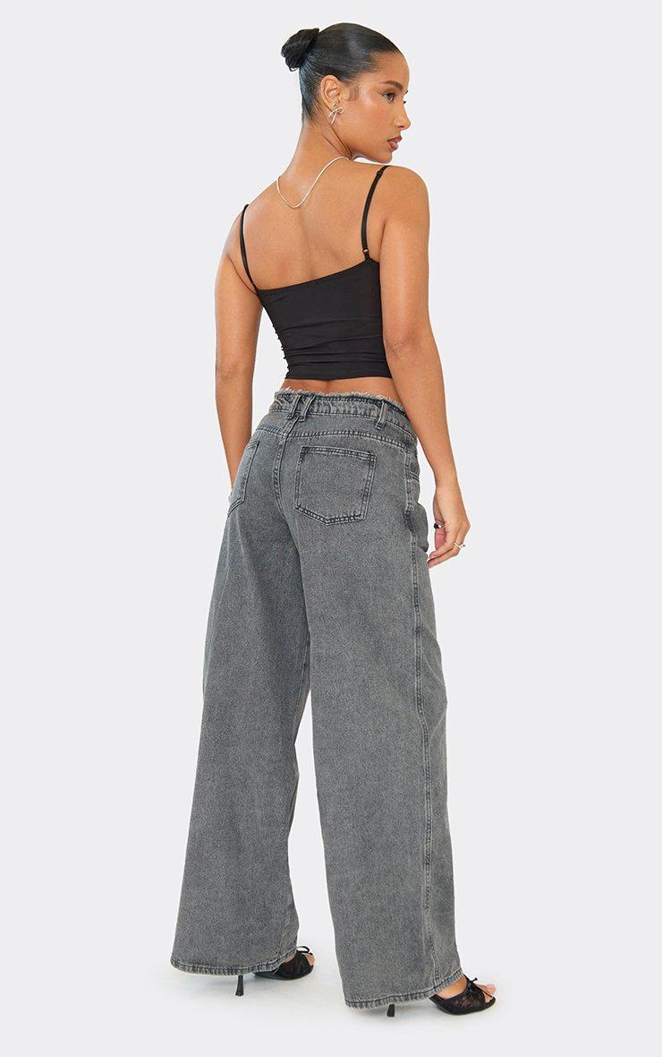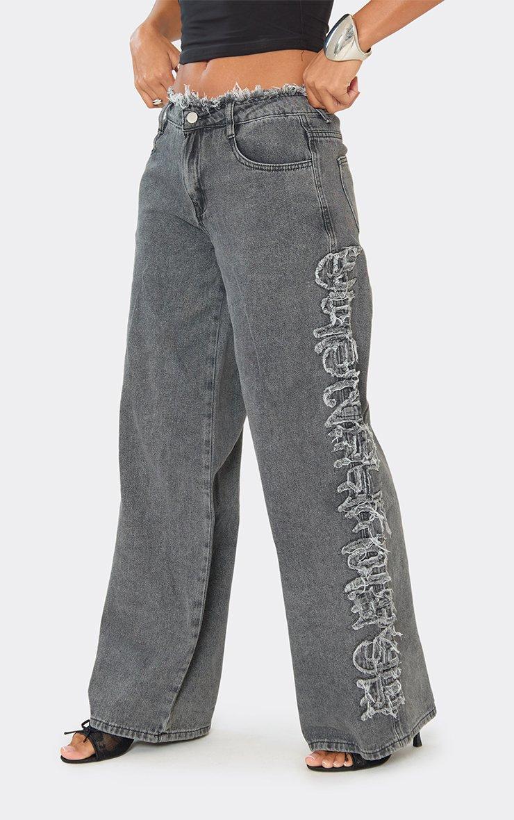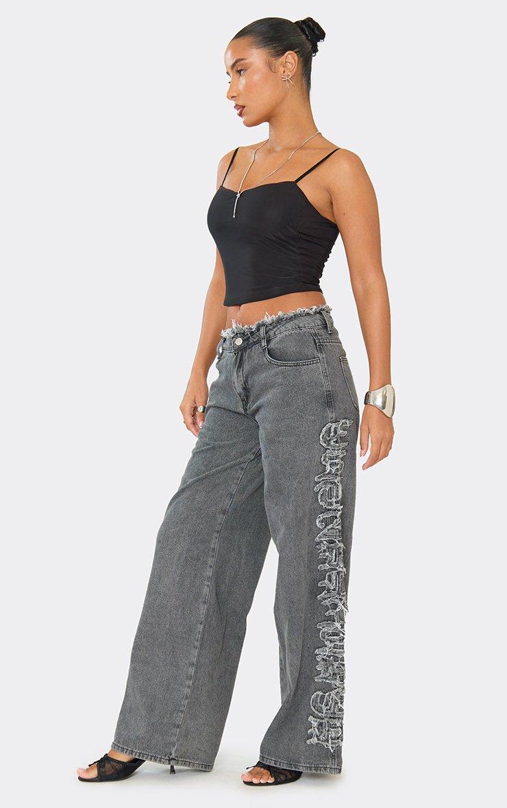 Low Rise Frayed Waist Established Graphic Detail Wide Leg Jeans In Black Denim