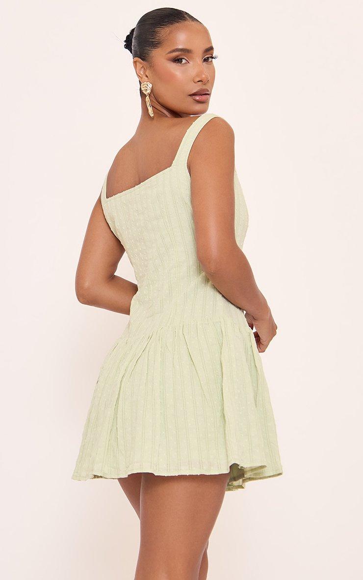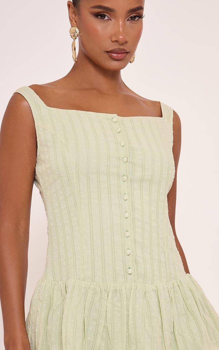 Square Neck Button Front Detail Mini Dress In Green Broderie