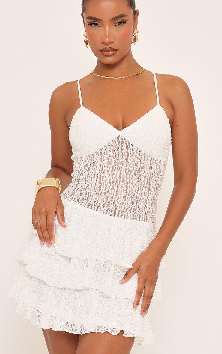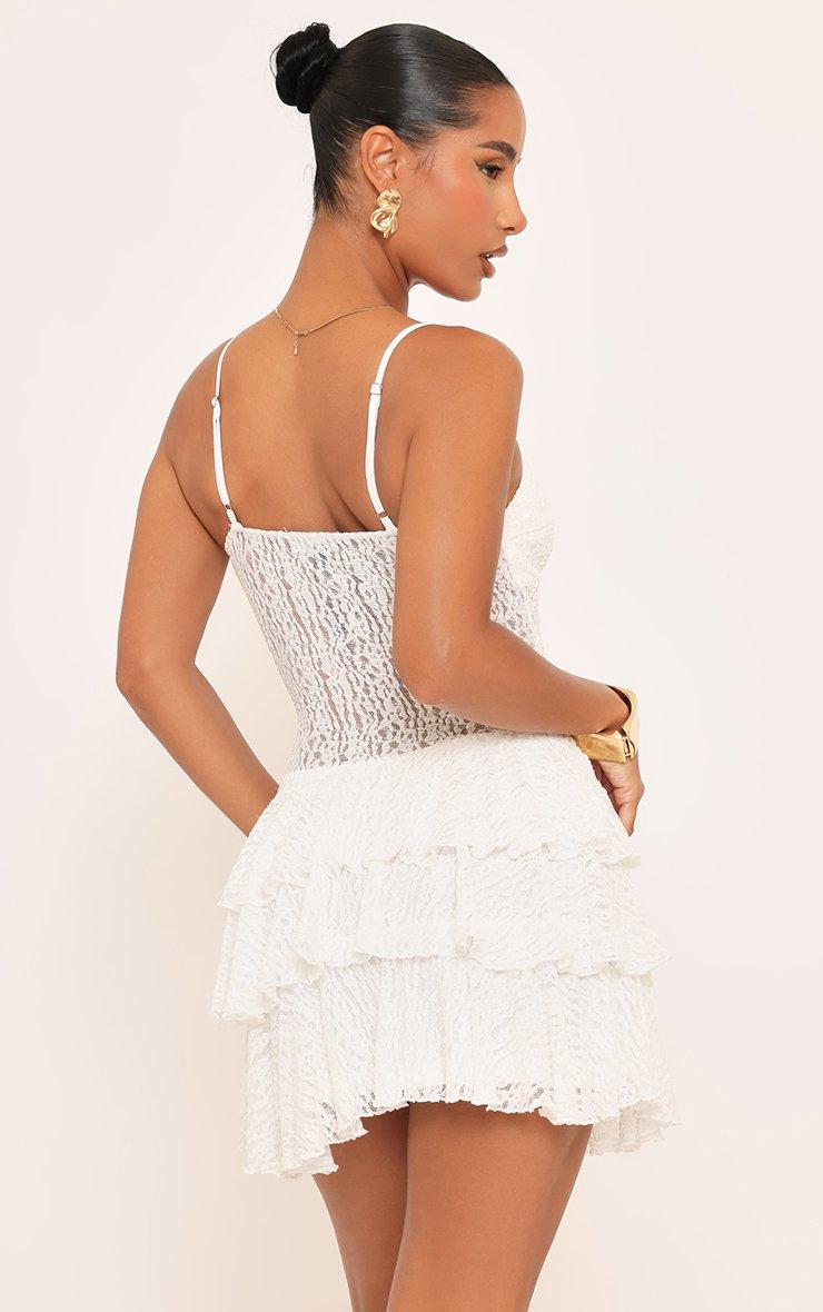 High Neck Cut Out Front Frilly Mini Dress In White Floral Textured Woven
