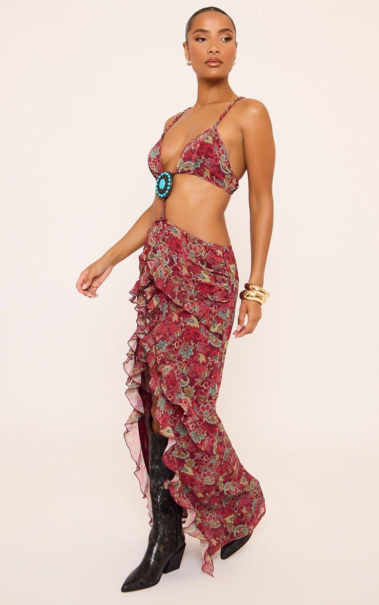 Plunge Neck Cut Out Detail Frilled Maxi Dress In Burgundy Paisley Print
