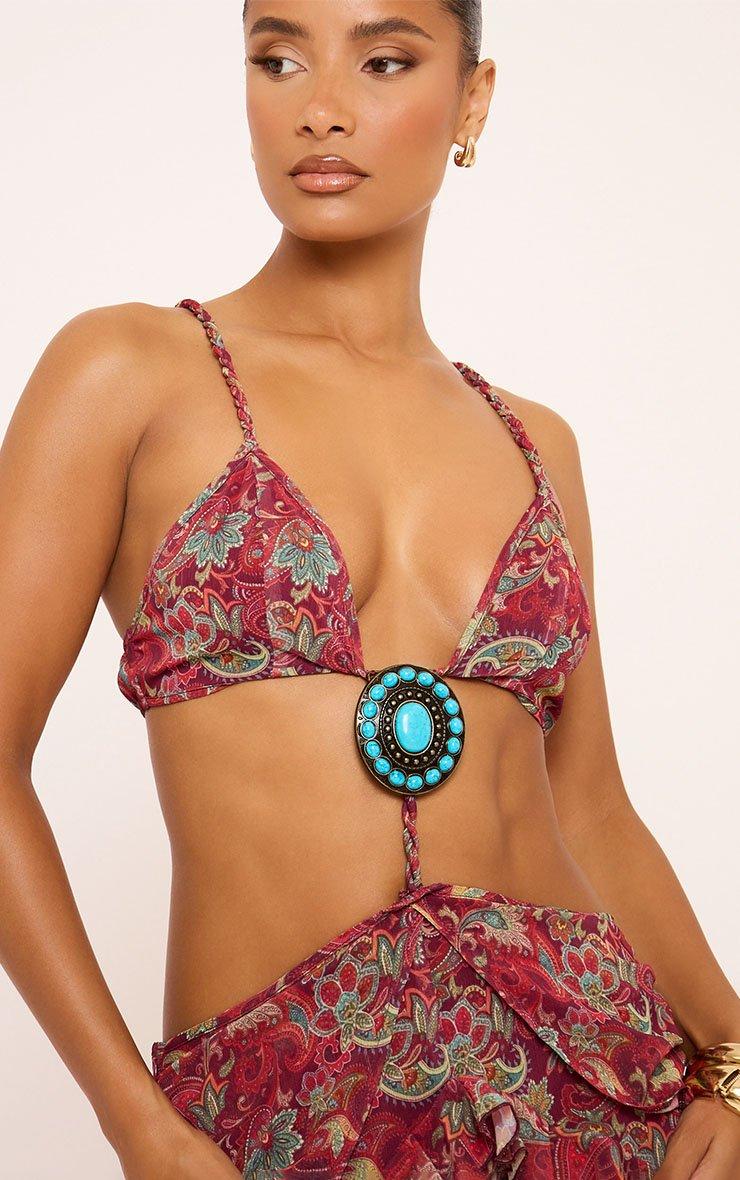 plunge neck cut out detail frilled maxi dress in burgundy paisley print