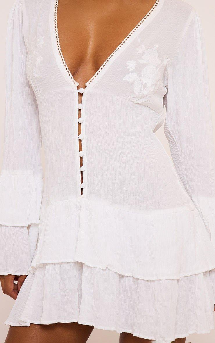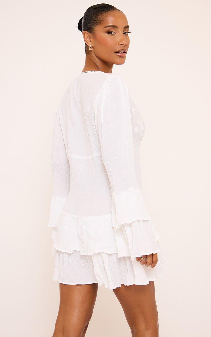Long Sleeve Embroidered Detail Frilled Mini Dress In White