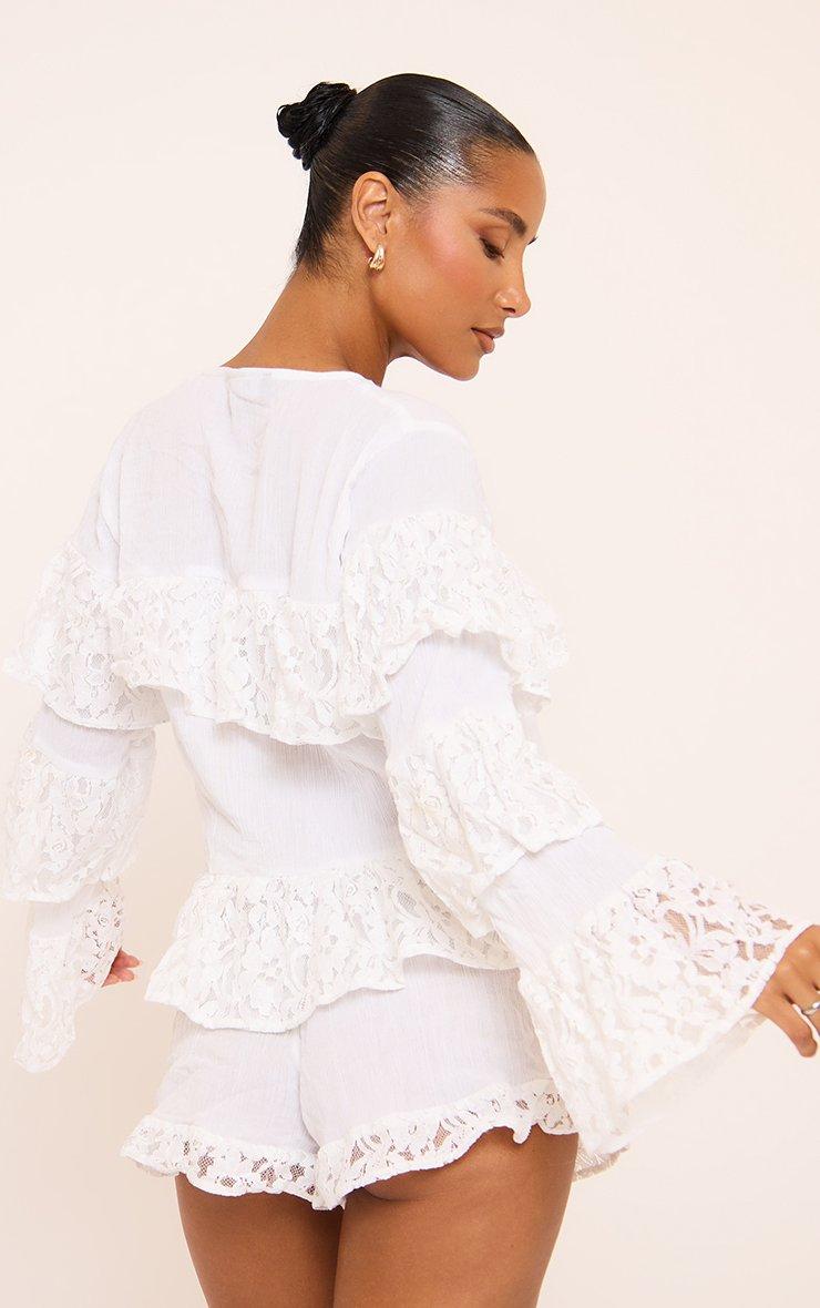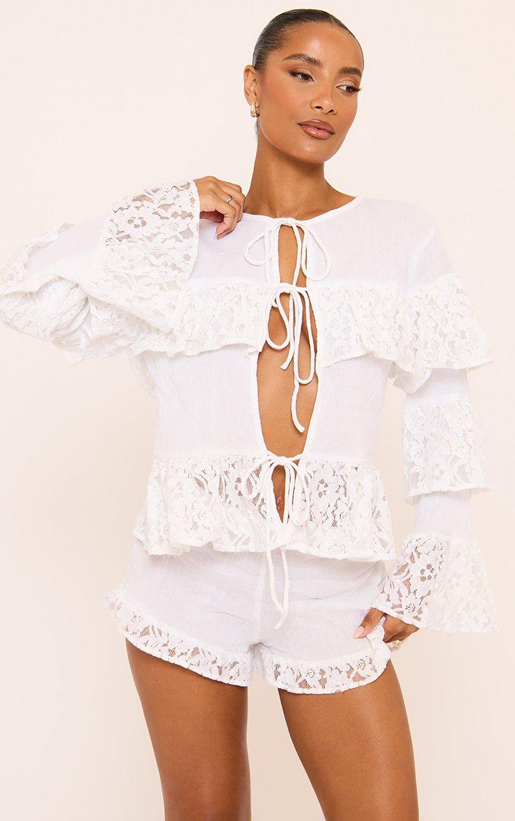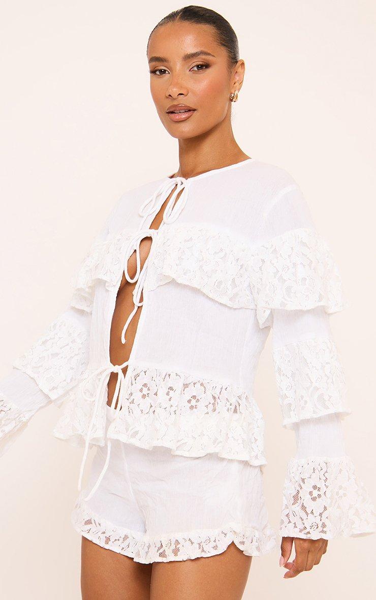 Long Sleeve Tie Front Frill Detail Top In White