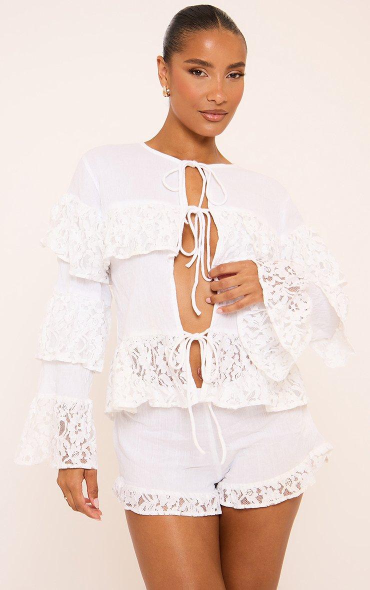 Mid Rise Tie Side Detail Shorts In White Broderie