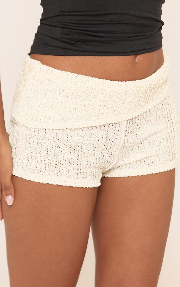 Mid Rise Elastic Waist Band Shorts In Cream Textured Crochet