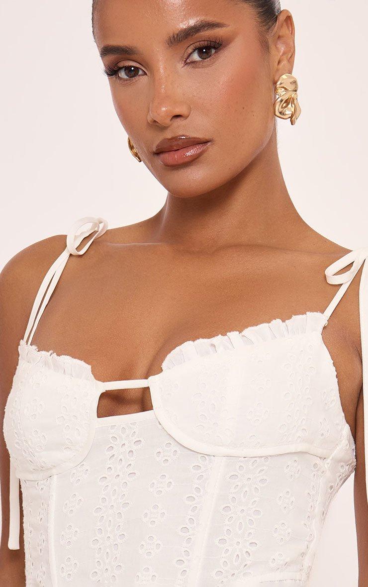 Sleeveless Tie Strap Detail Frill Hem Corset Top In White Broderie