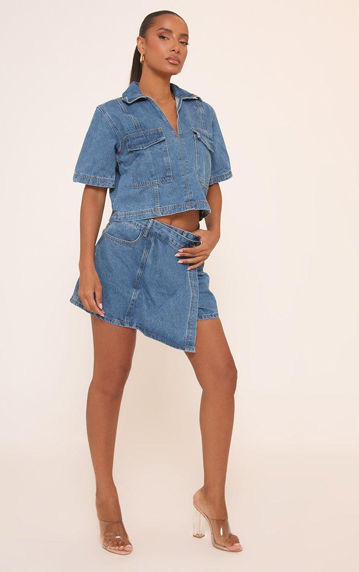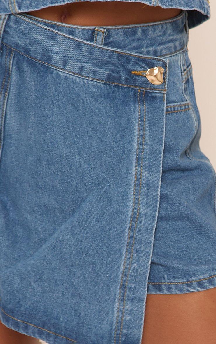 Mid Rise Wrapover Skort In Indigo Blue Denim