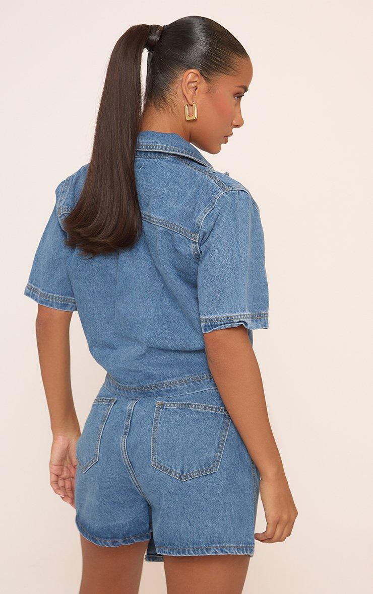 Short Sleeve Collared Pocked Detail Top In Indigo Blue Denim