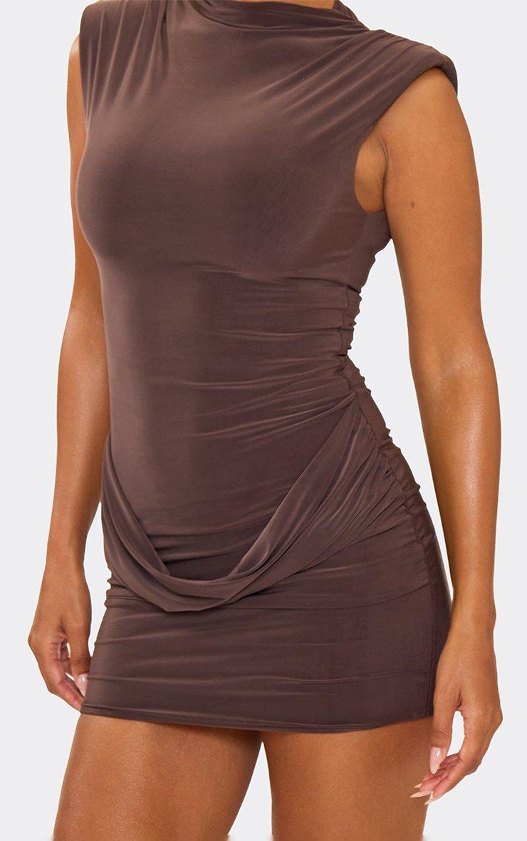 high neck shoulder pad cap sleeve draped front mini dress in chocolate brown