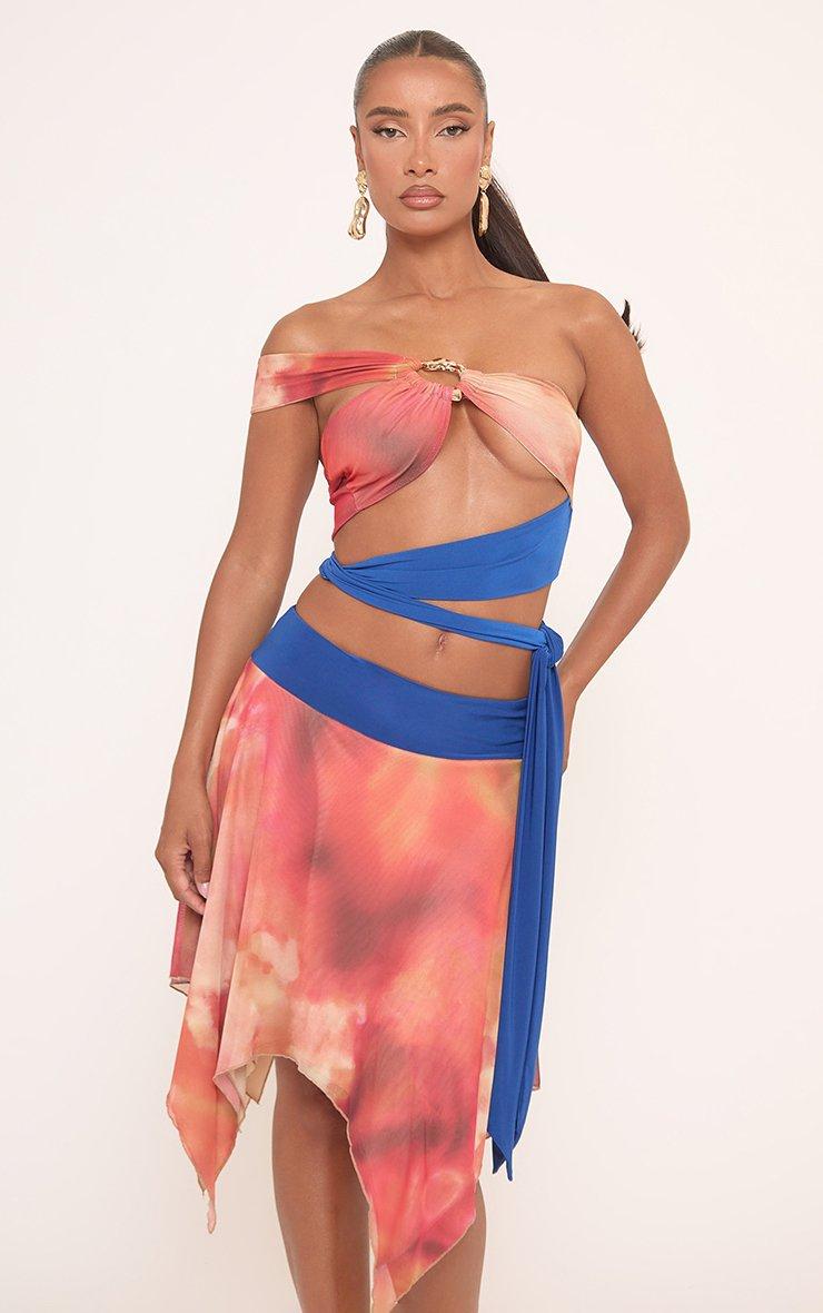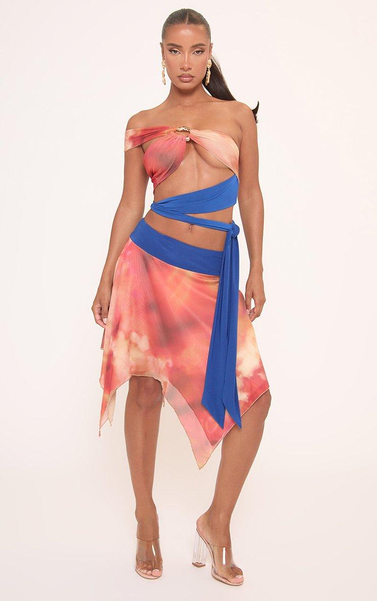 Low Rise Knotted Side Mini Skirt In Multi Wave Print Crochet
