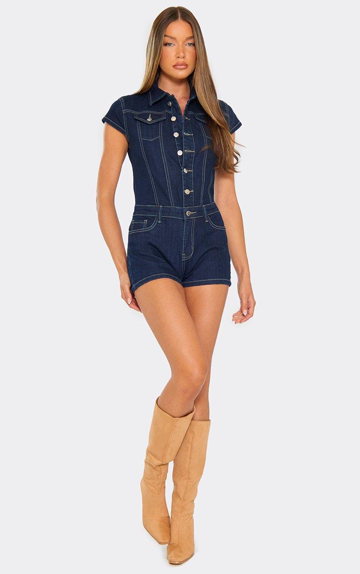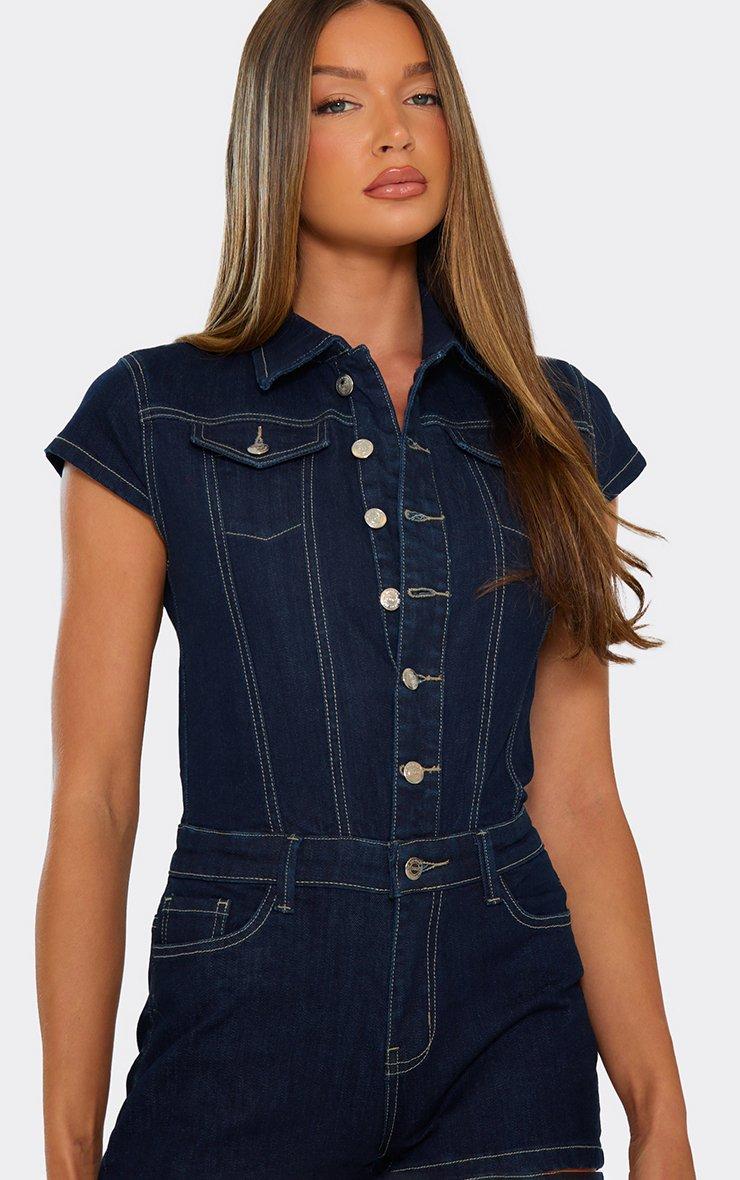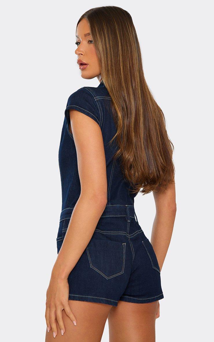 Short Sleeve Zip Up Front Fitted Playsuit In Indigo Blue Denim