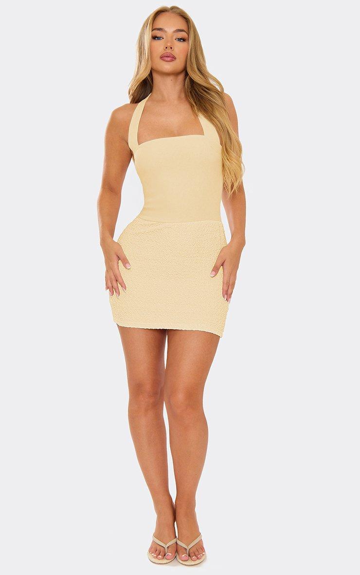 Halterneck Textured Skirt Detail Mini Bodycon Dress In Cream
