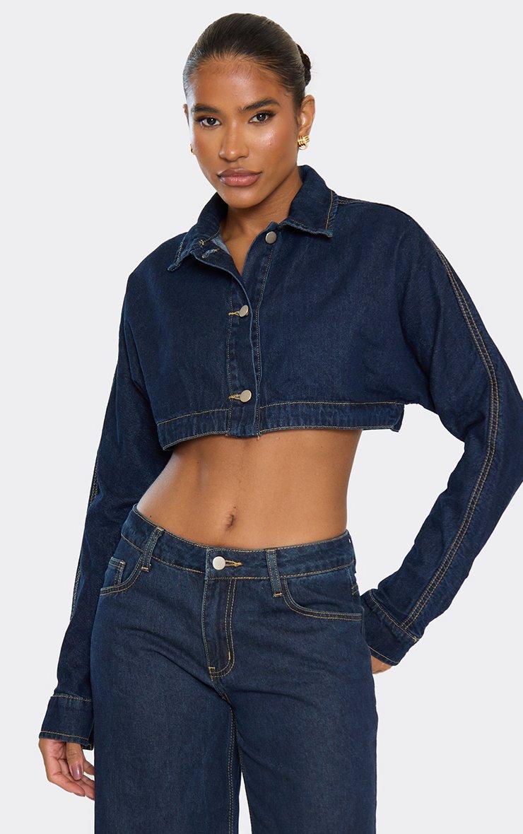 Long Batwing Sleeve Collared Cropped Top In Indigo Denim