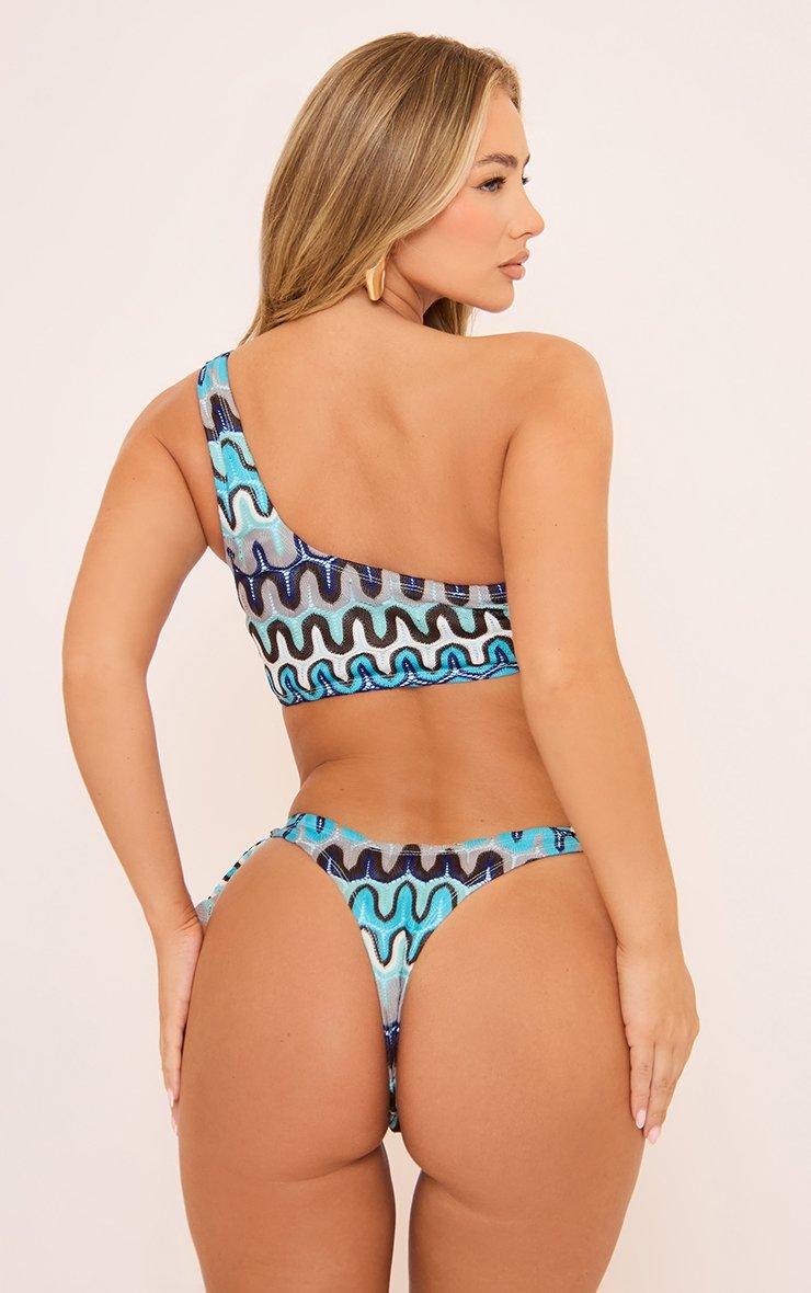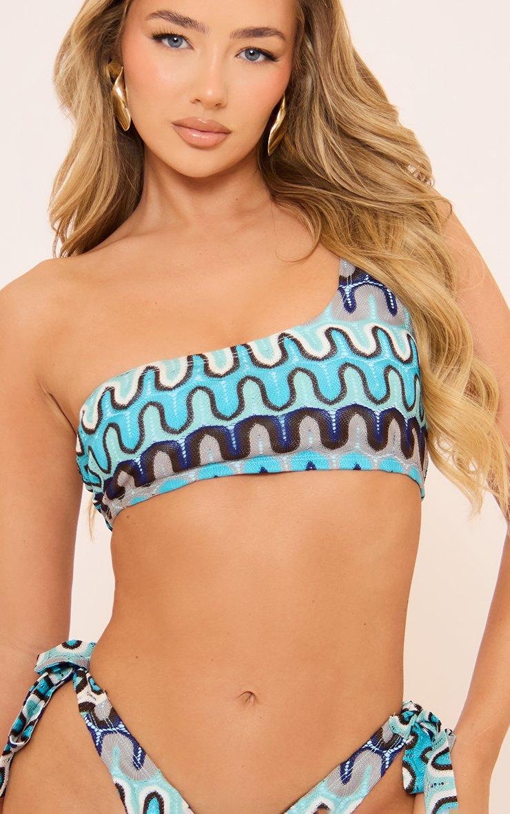One Shoulder Tie Side Bikini Set In Blue Aztec Print Texture