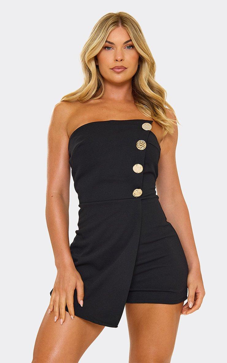 asymmetric bandeau button front detail playsuit in black