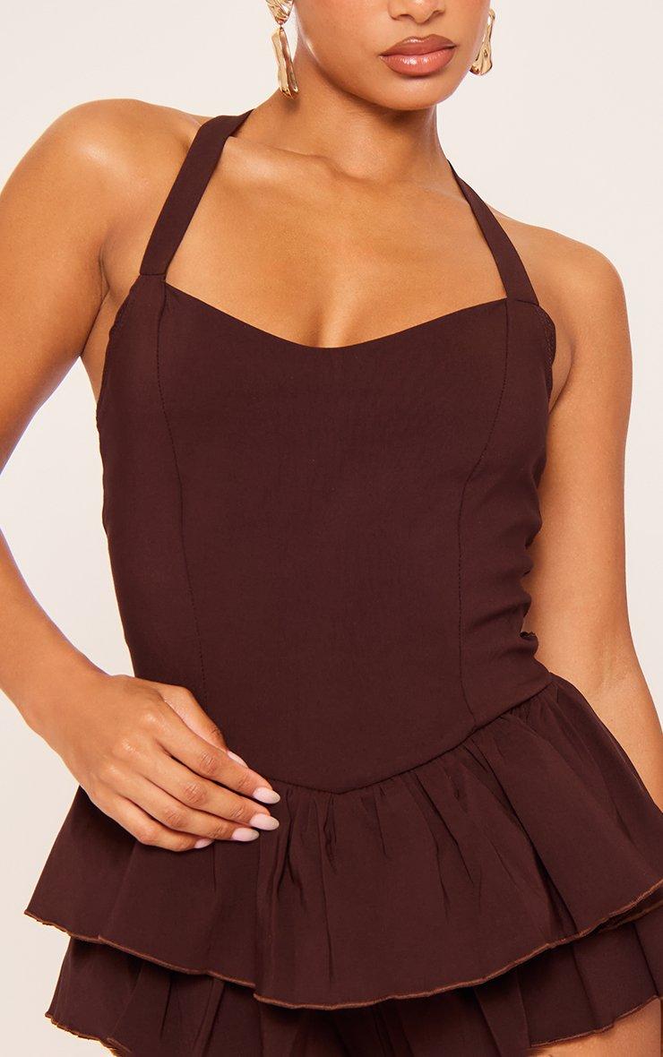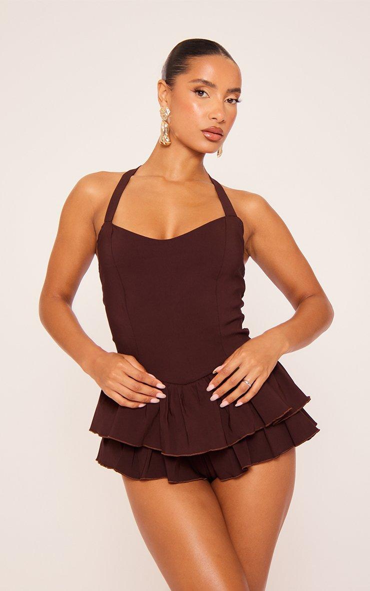 Halterneck Frill Hem Detail Playsuit In Brown