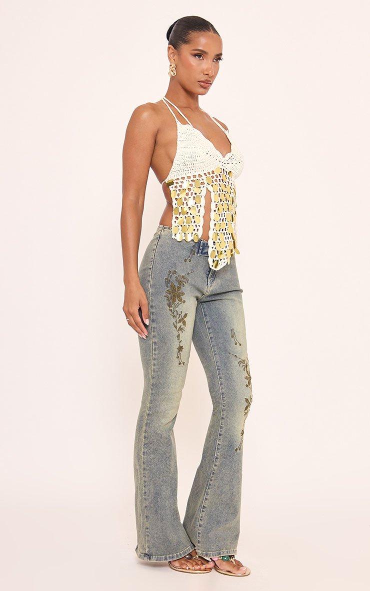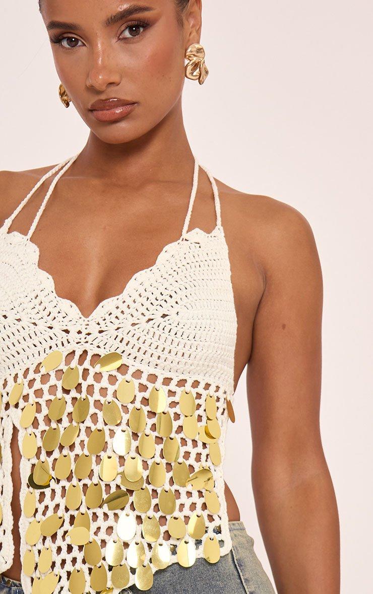 Halterneck Disc Sequin Detail Top In Cream Crochet Knit