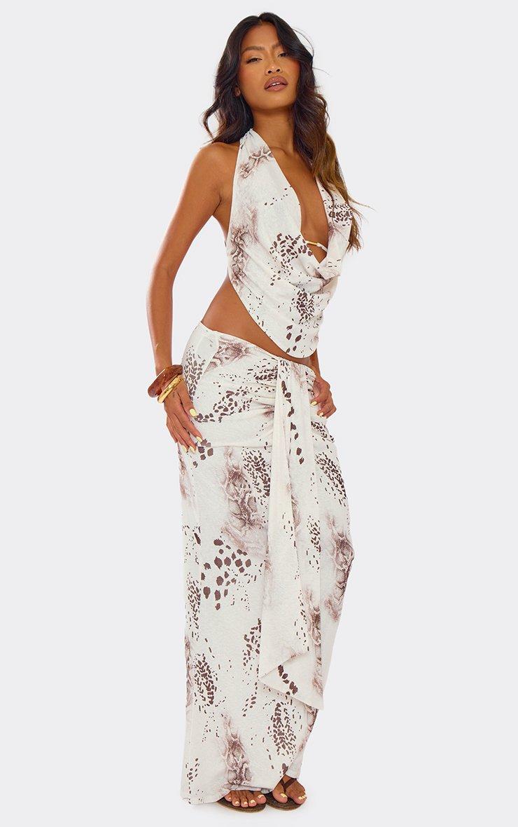 Low Waist Drape Front Detail Maxi Skirt In Cream Animal Printed Mesh
