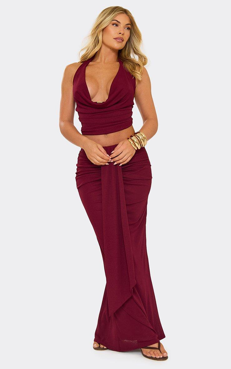 Low Waist Drape Front Maxi Skirt In Burgundy