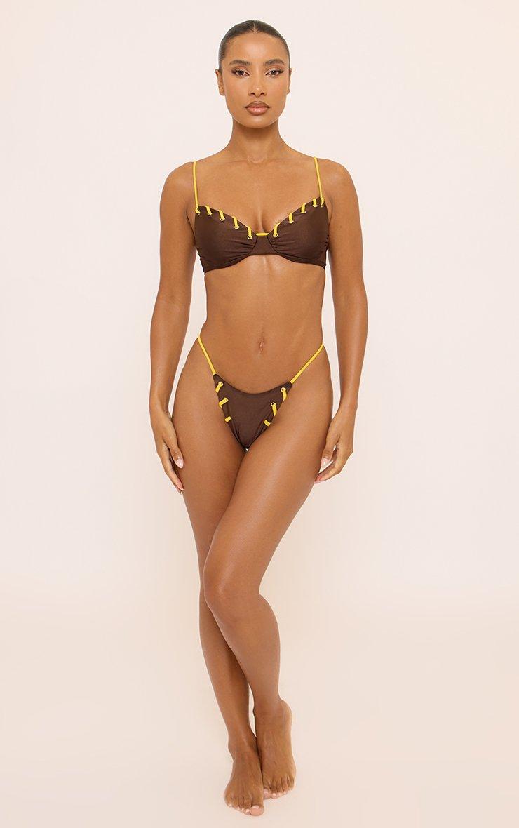 Halterneck Cut Out Front Bead Trim Detail Swimsuit In Brown