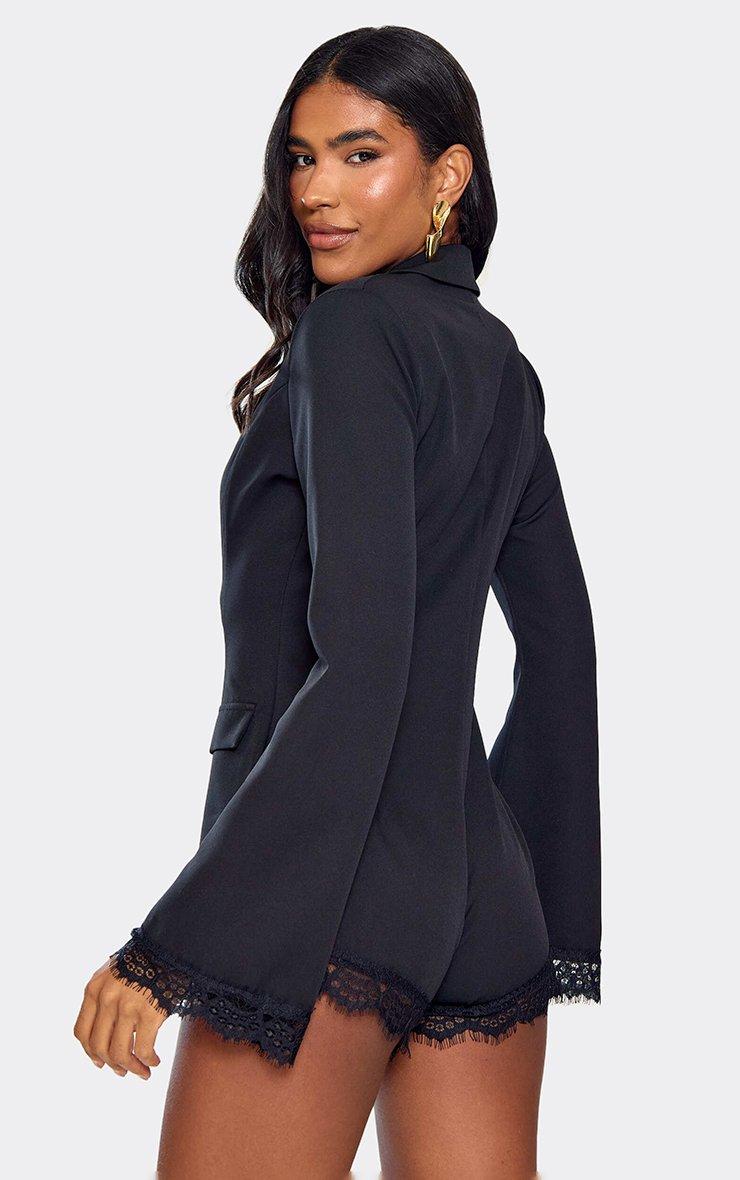 Long Sleeve Lace Trim Detail Blazer Playsuit In Black