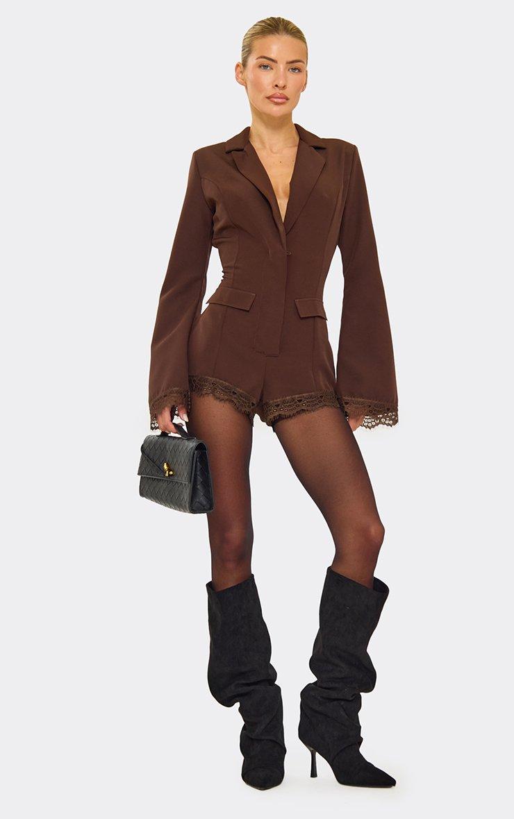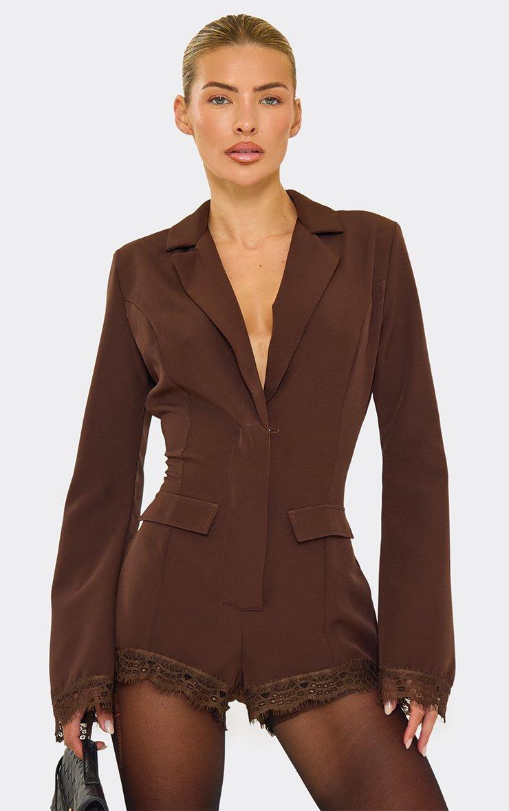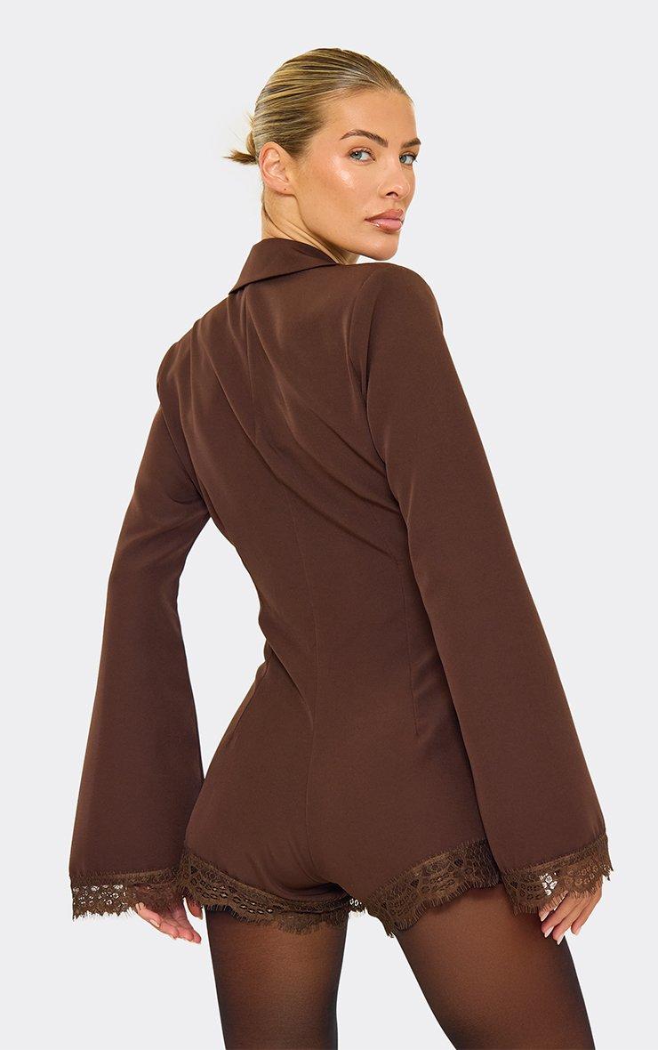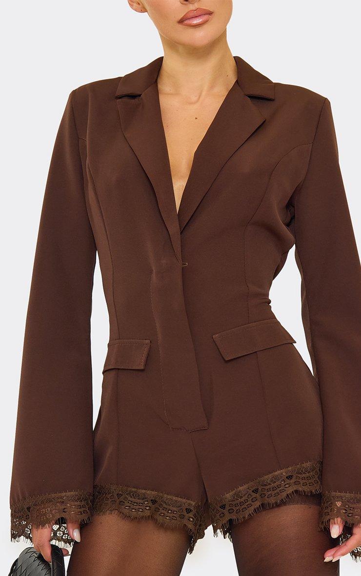 Long Sleeve Plunge Neck Lace Trim Detail Blazer Playsuit In Chocolate Brown
