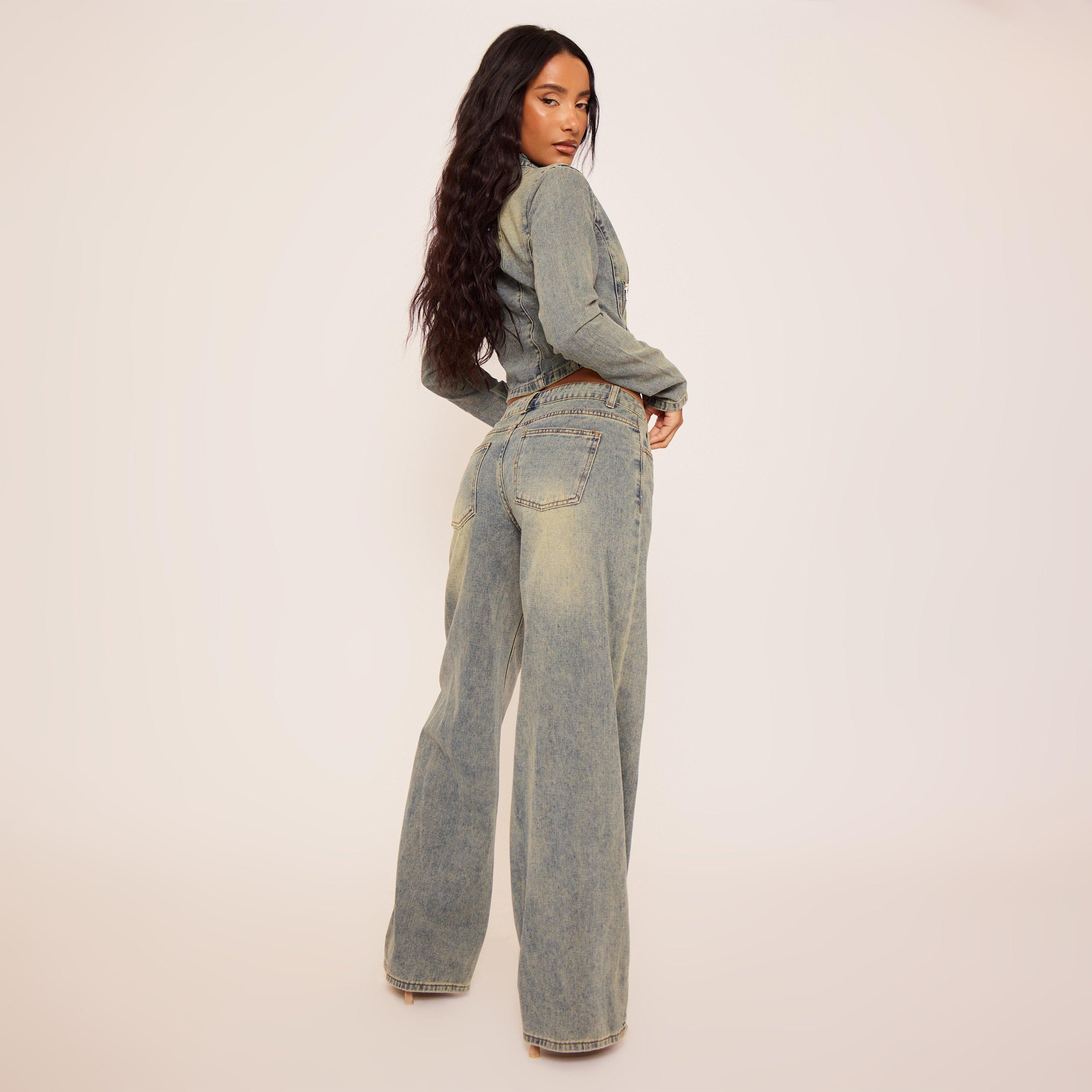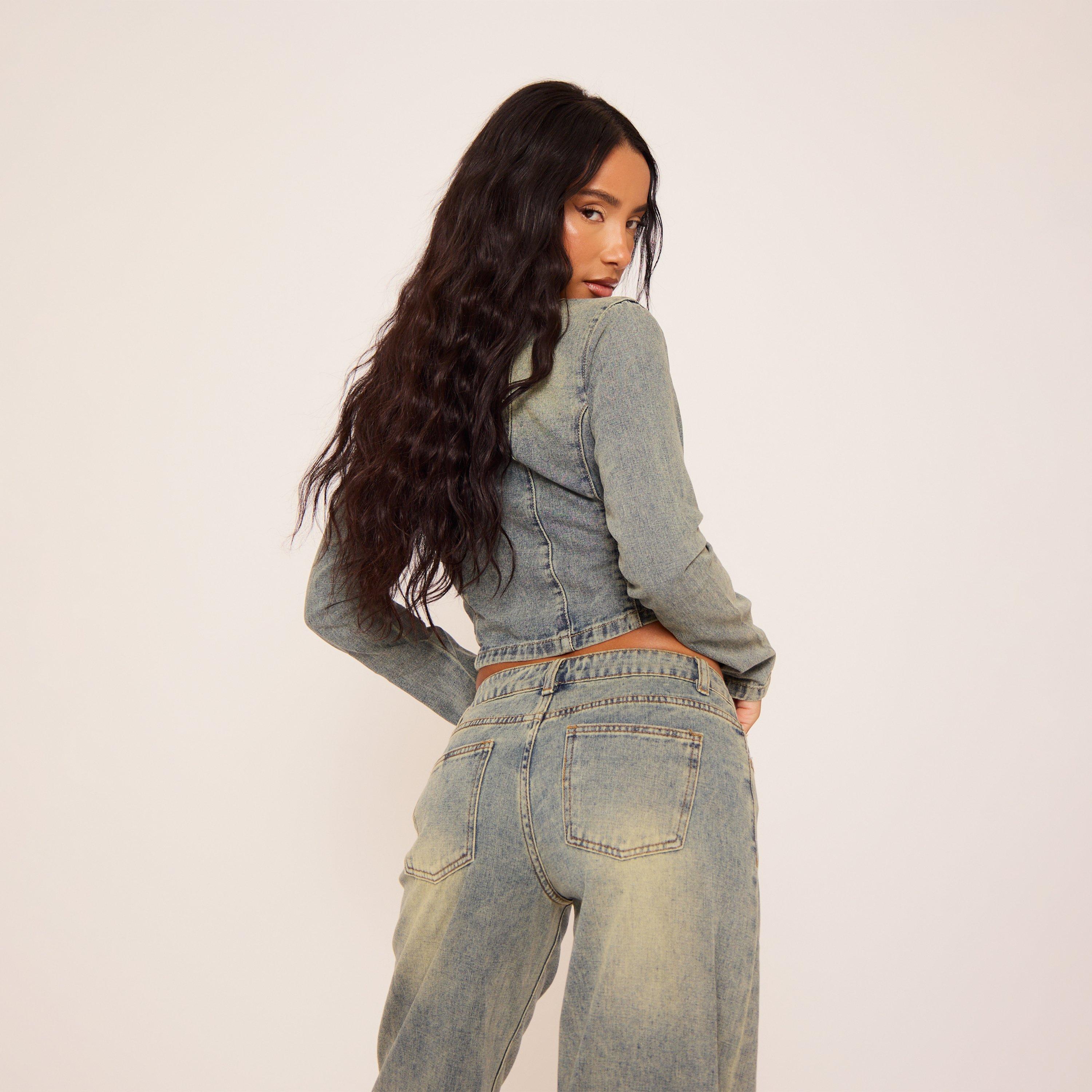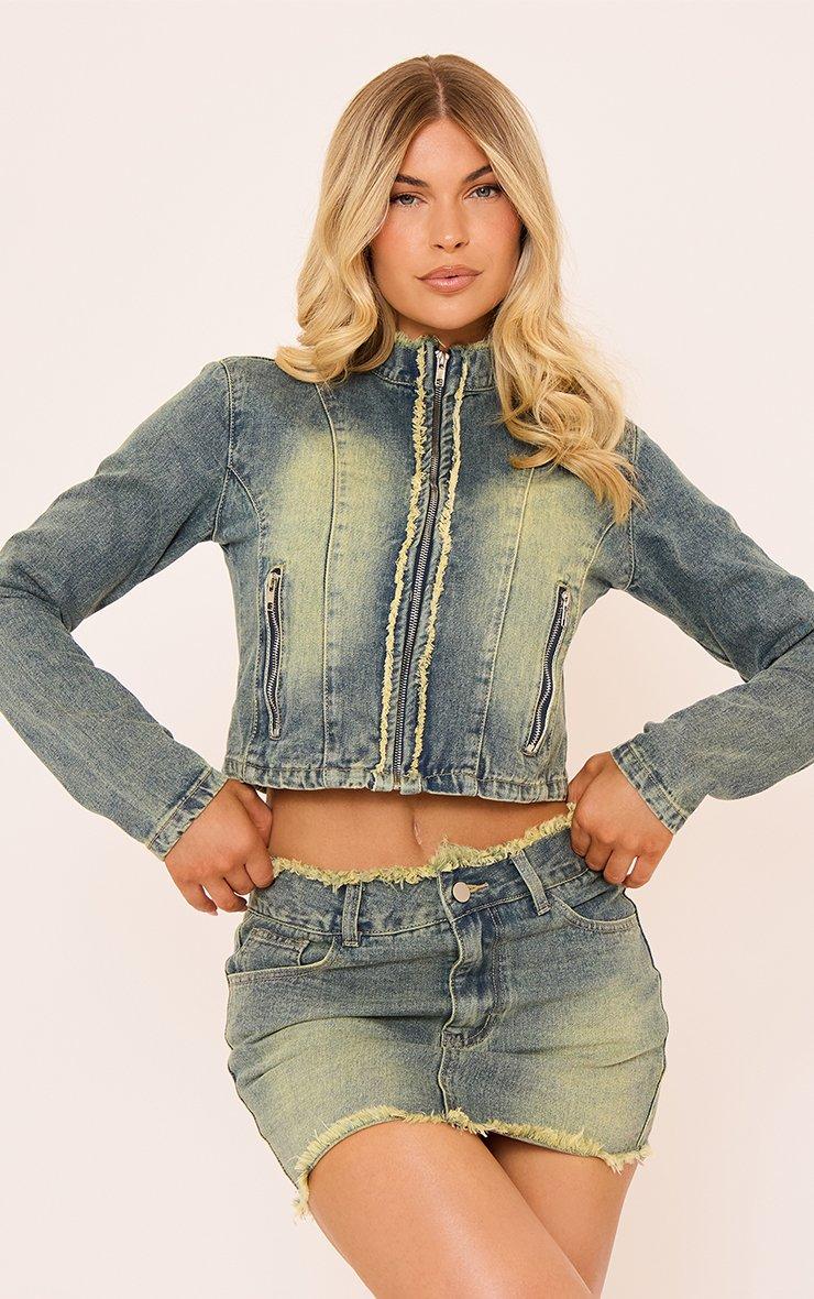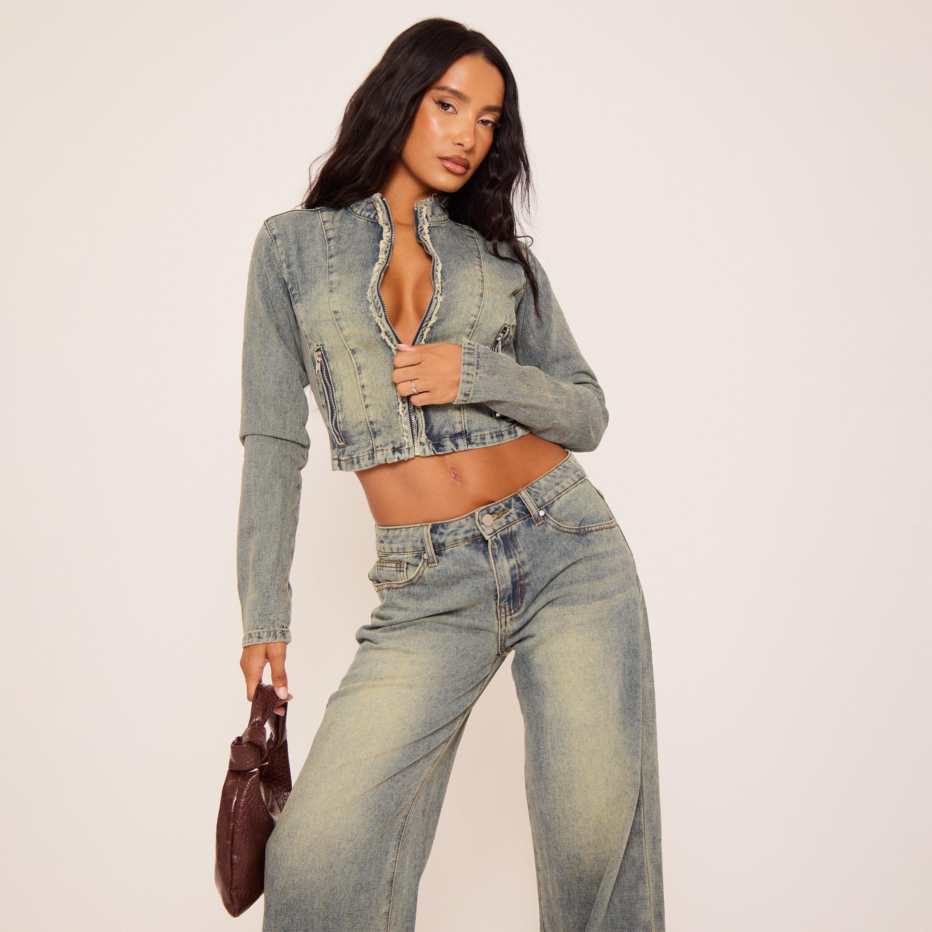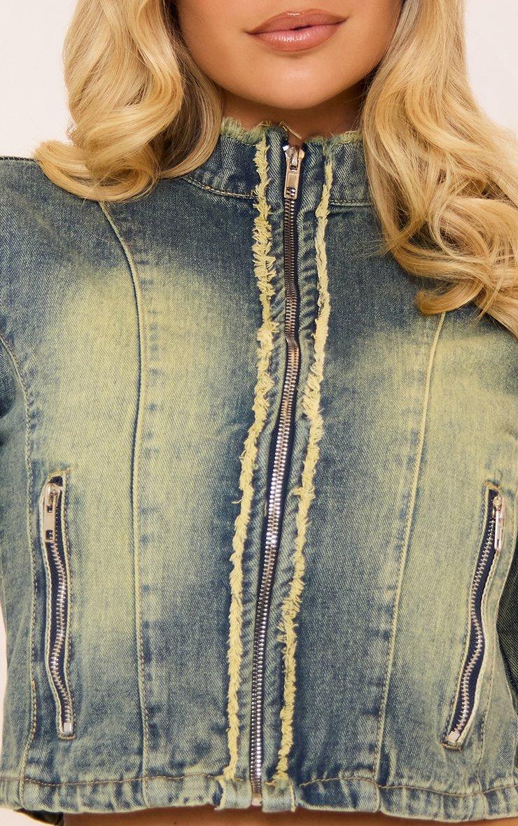 High Neck Frayed Hem Detail Fitted Jacket In Vintage Blue Denim