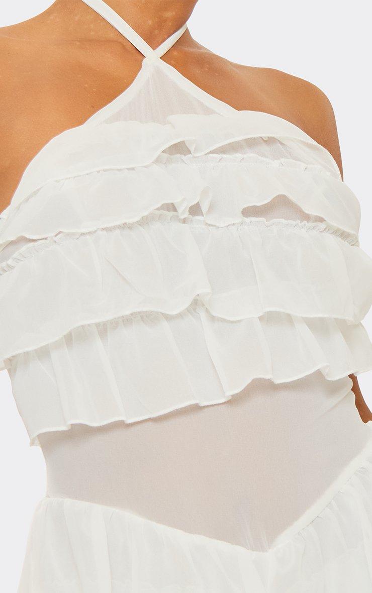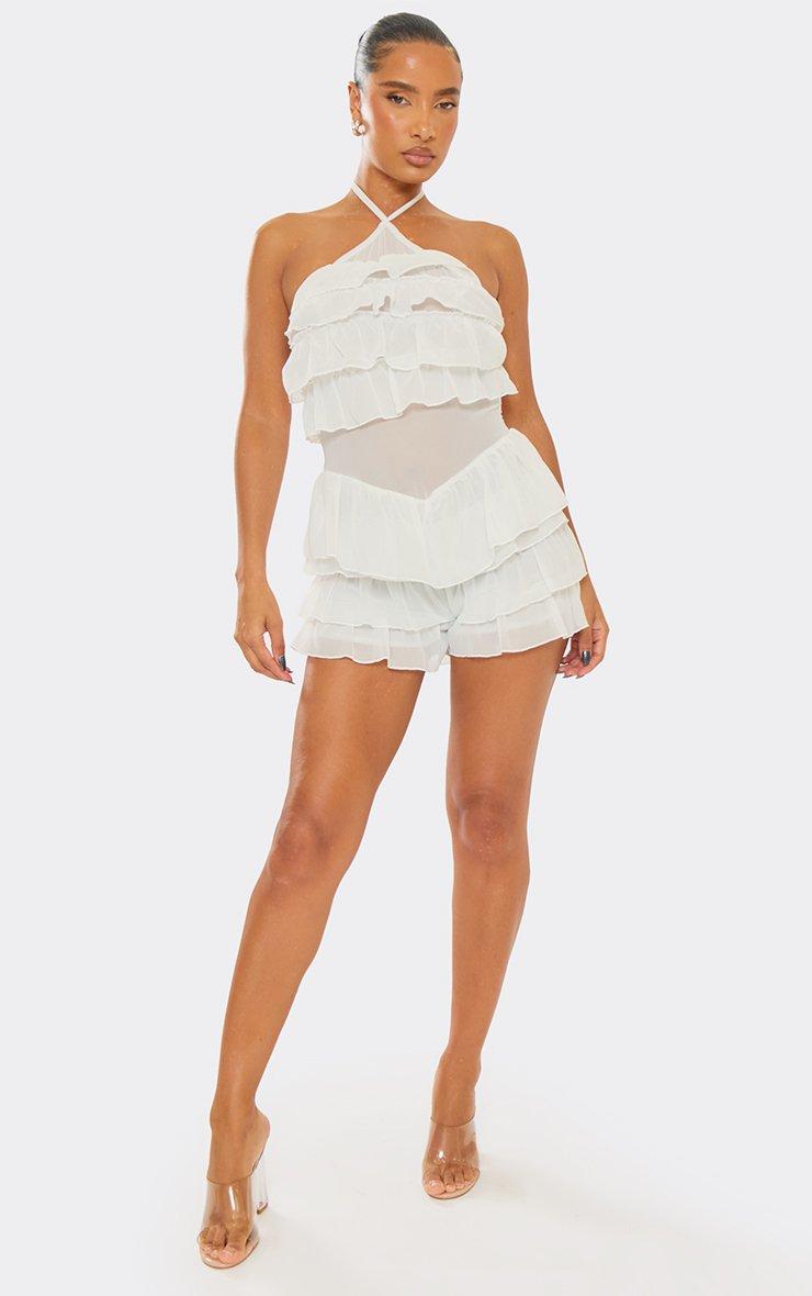 Plunge Halterneck Ruffle Trim Detail Playsuit In Cream Texture