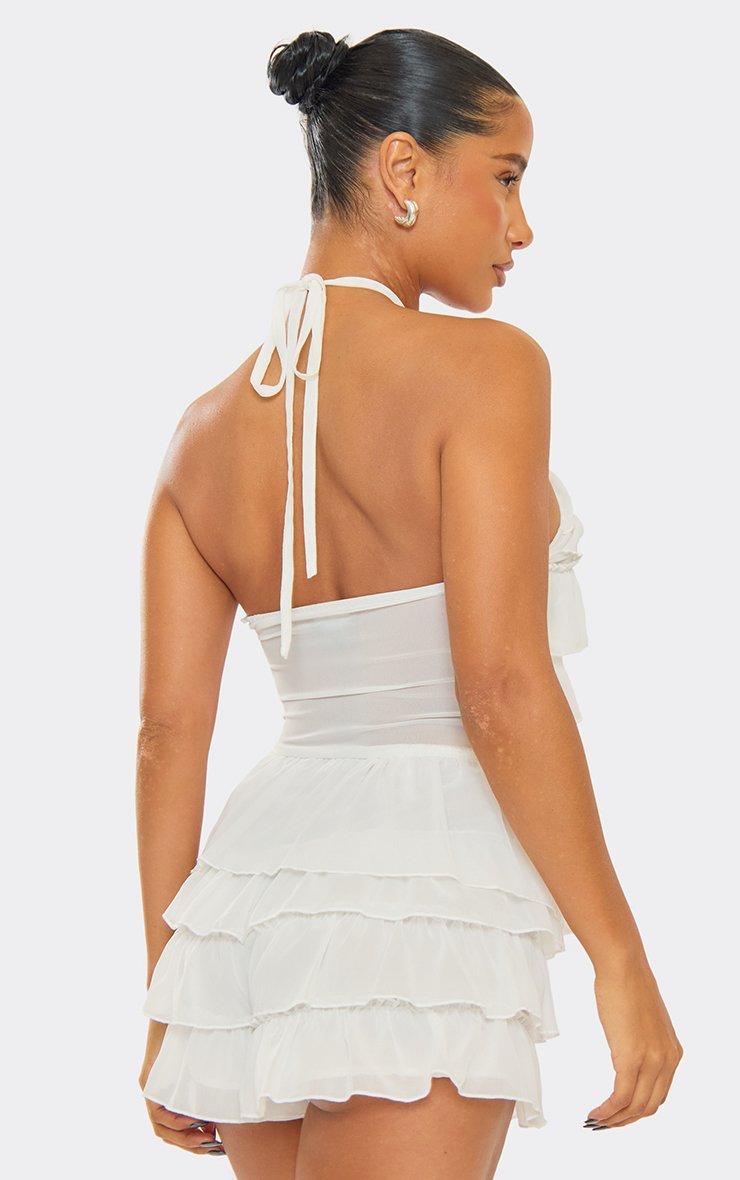 Halterneck Rose Detail Ruffle Micro Playsuit In Cream
