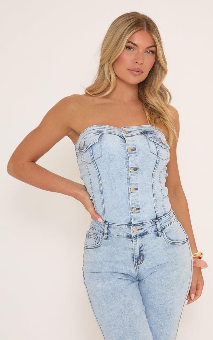 Bandeau Button Down Jumpsuit In Light Blue Wash Denim