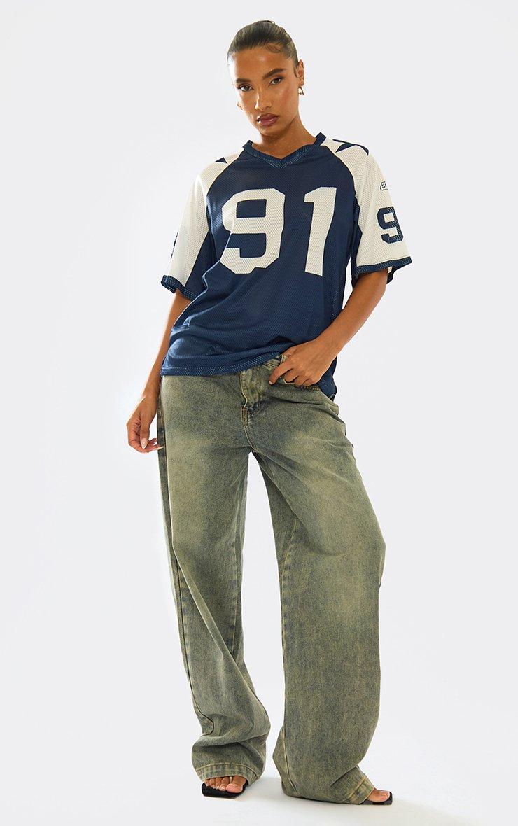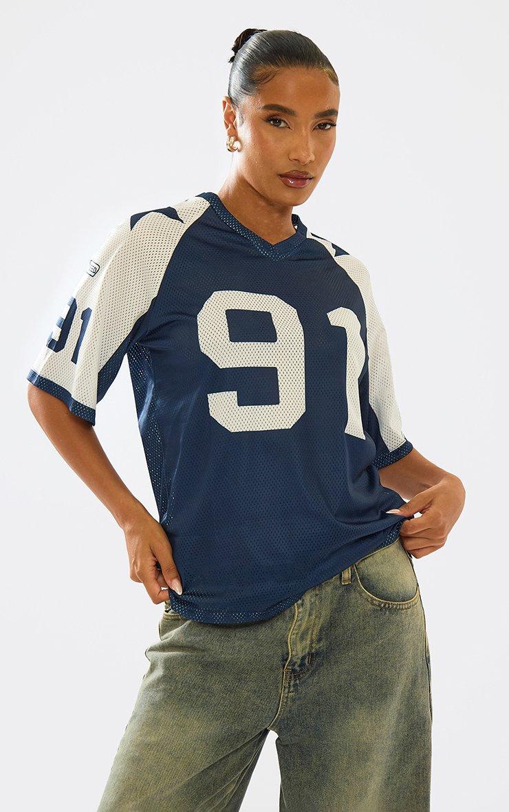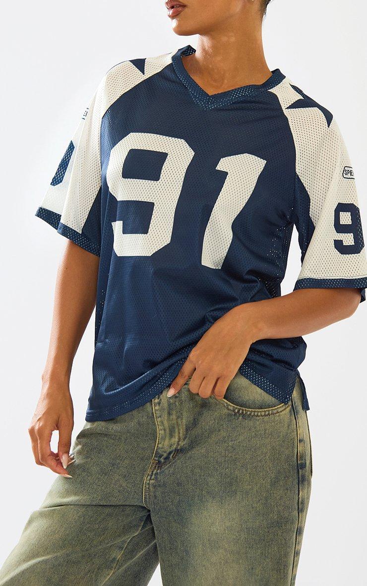 Short Sleeve Contrast Detail Oversized Football Jersey Top In Blue