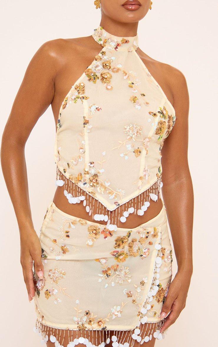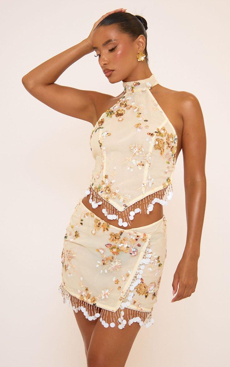 Mid Waist Wrap Over Bead Trim Detail Sequin Embellished Mini Skirt In Cream
