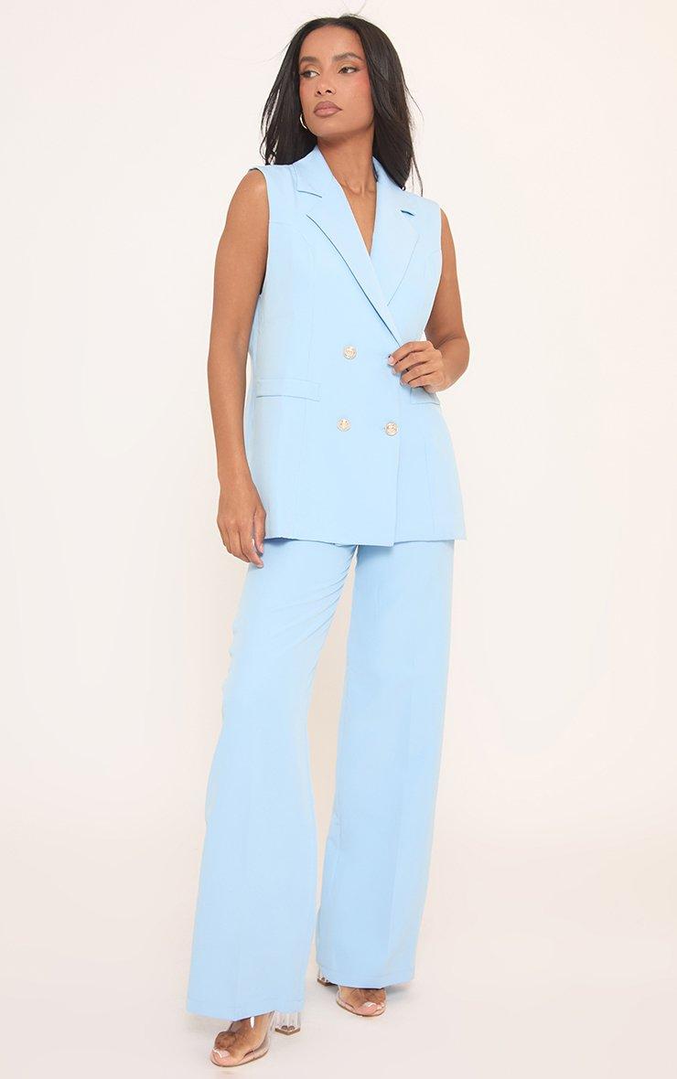 Ruched Front Tie Waist Wide Leg Trousers In Blue