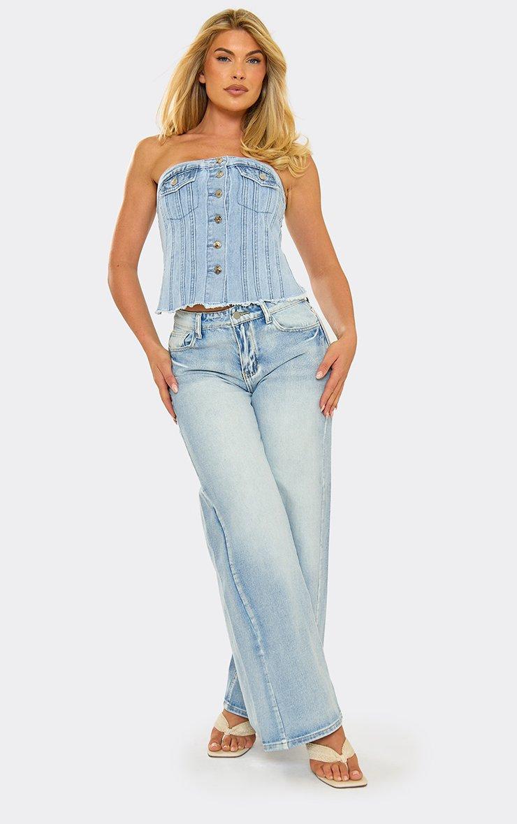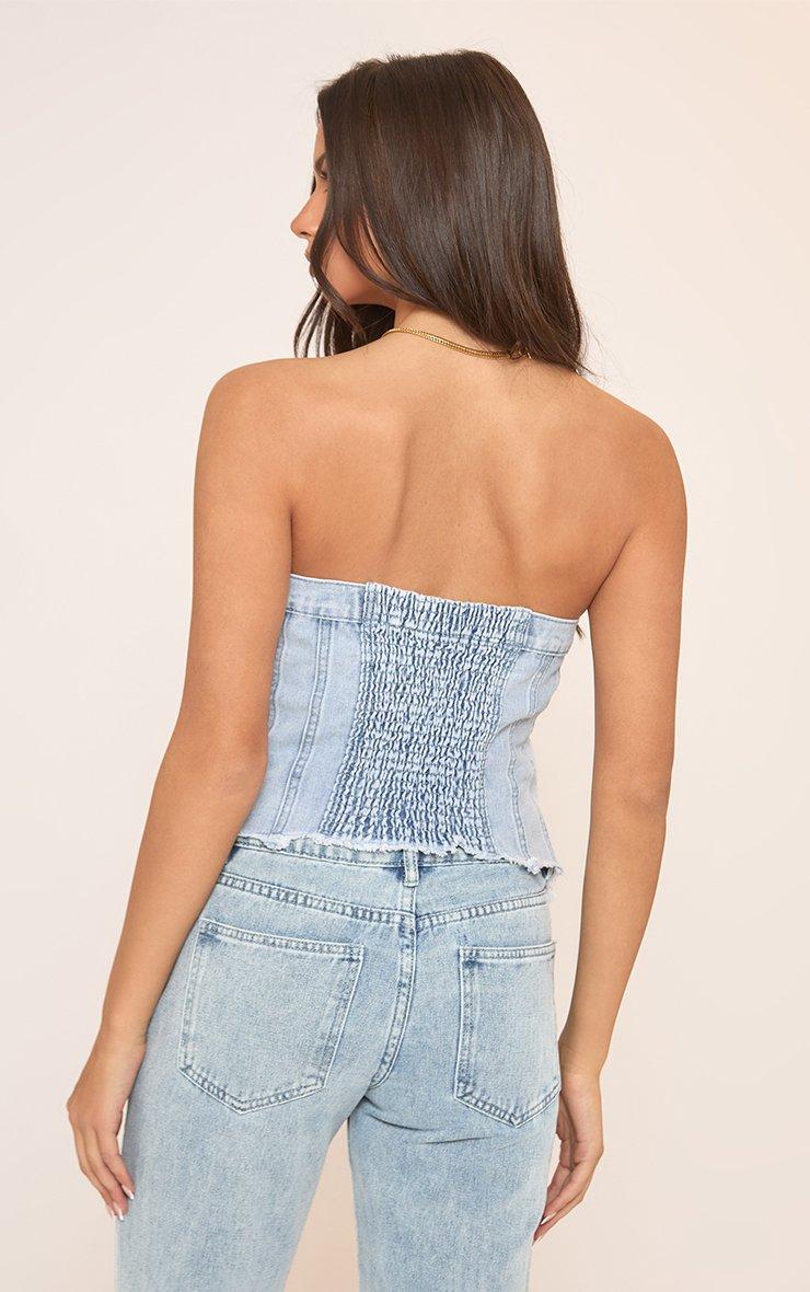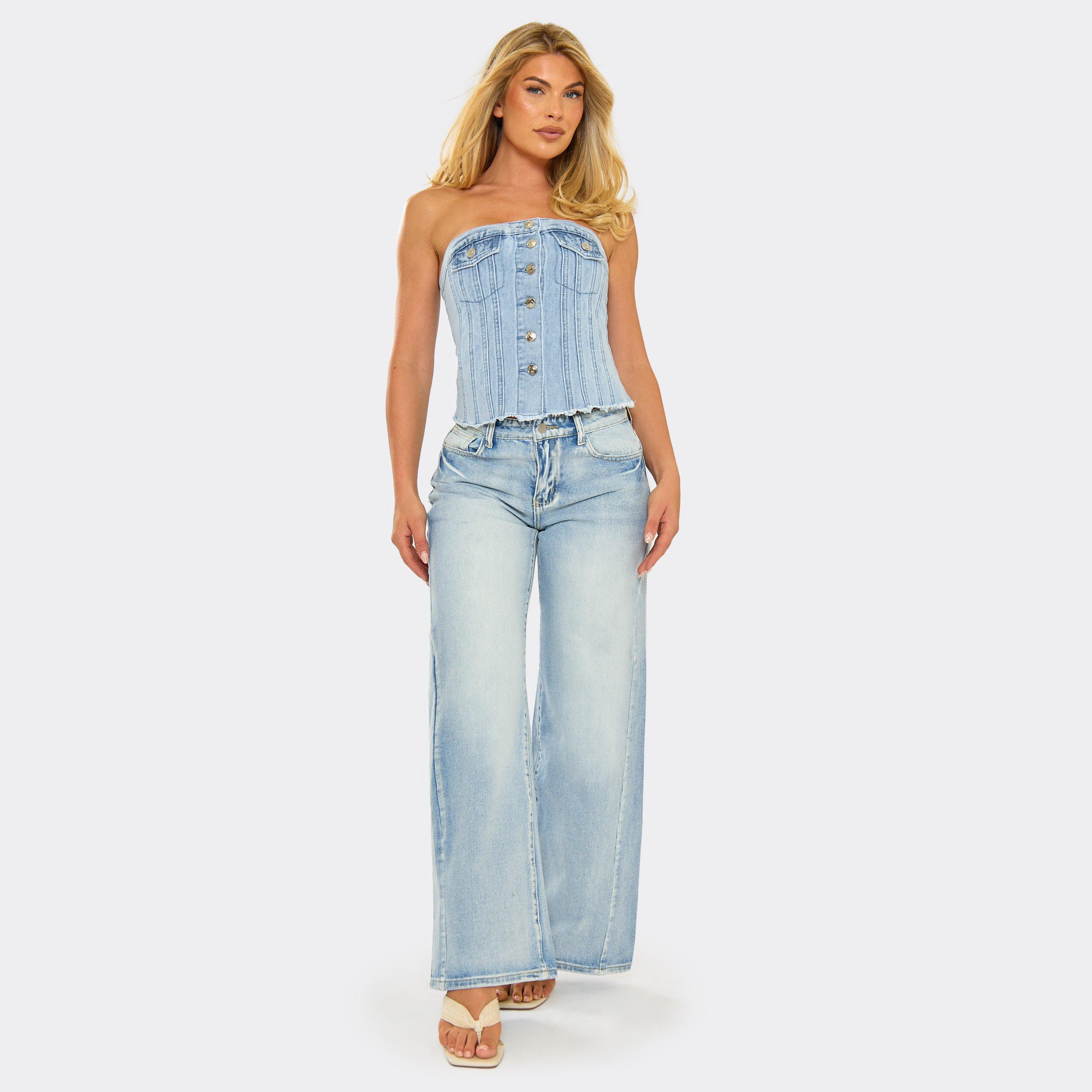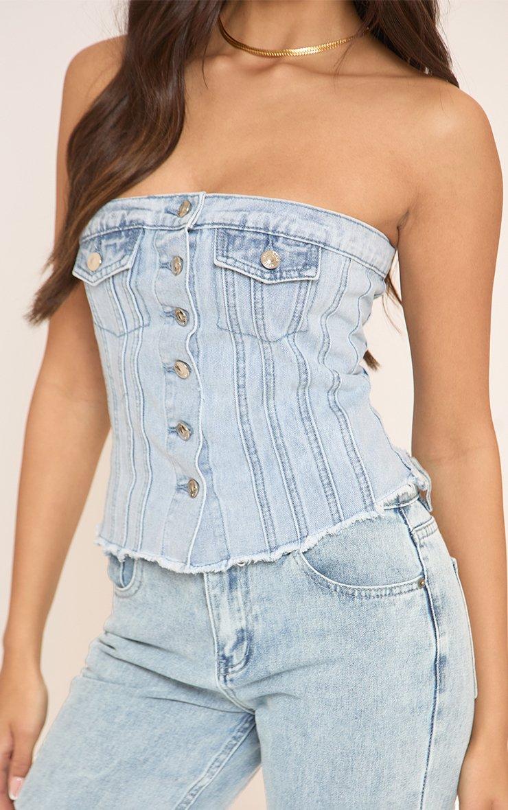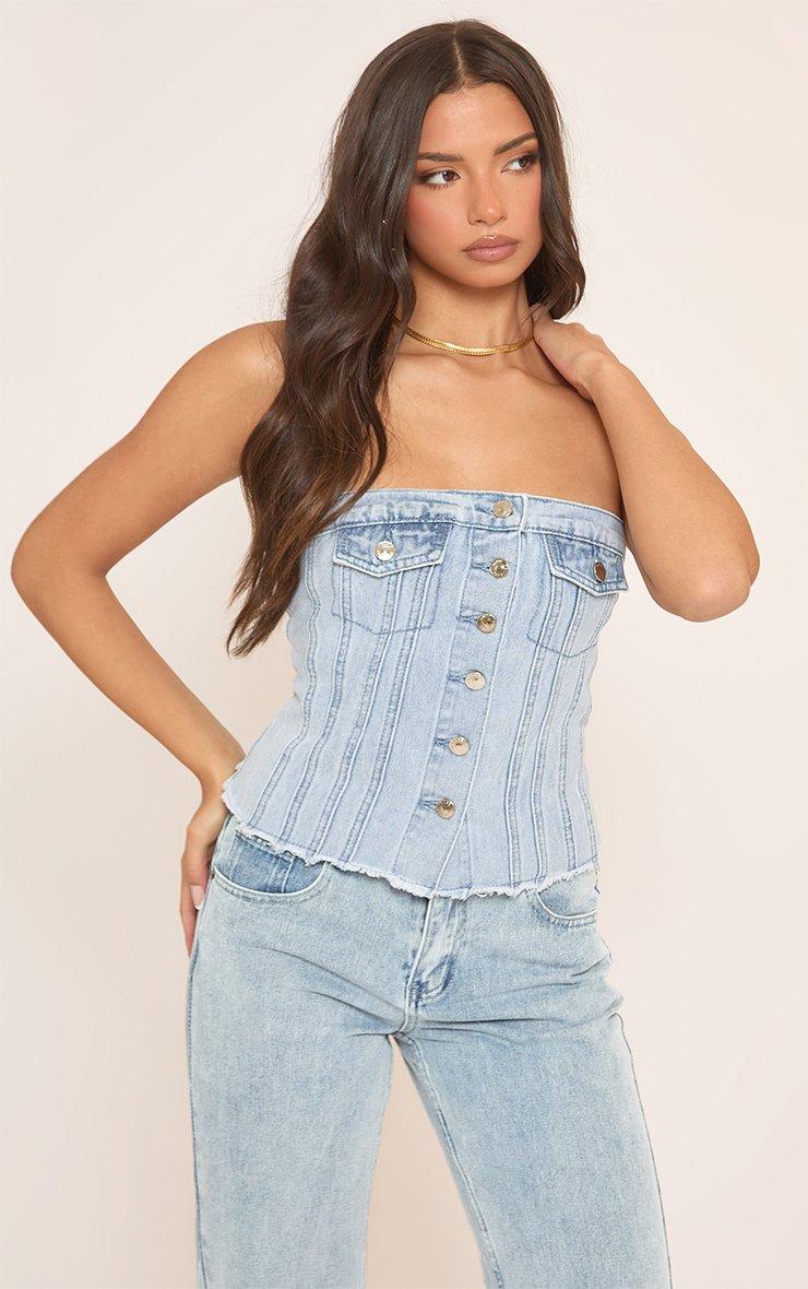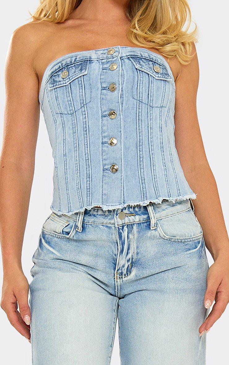 Bandeau Button Up Front Top In Blue Denim