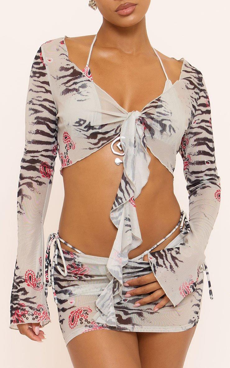 Long Sleeve Tie Front Detail Top In Grey Abstract Animal Print