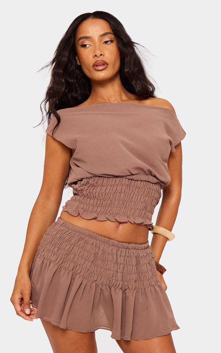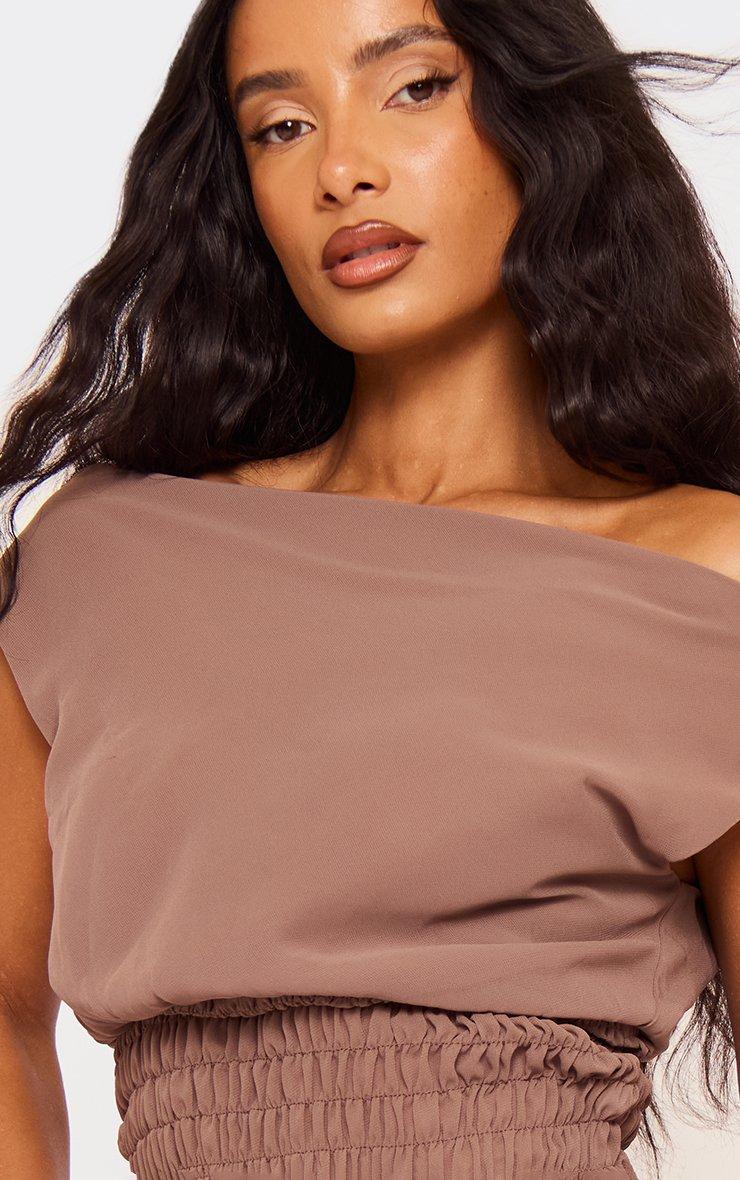 Off The Shoulder Shirred Waist Detail Asymmetric Top In Brown