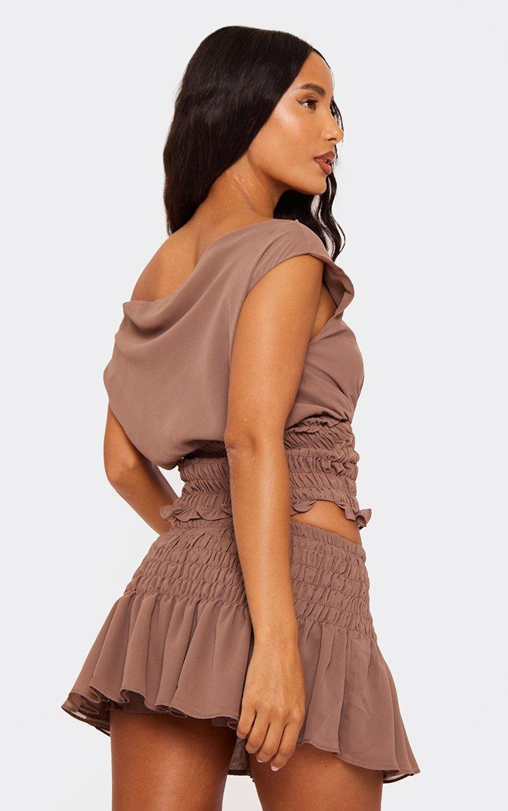 off the shoulder shirred waist detail asymmetric top in brown
