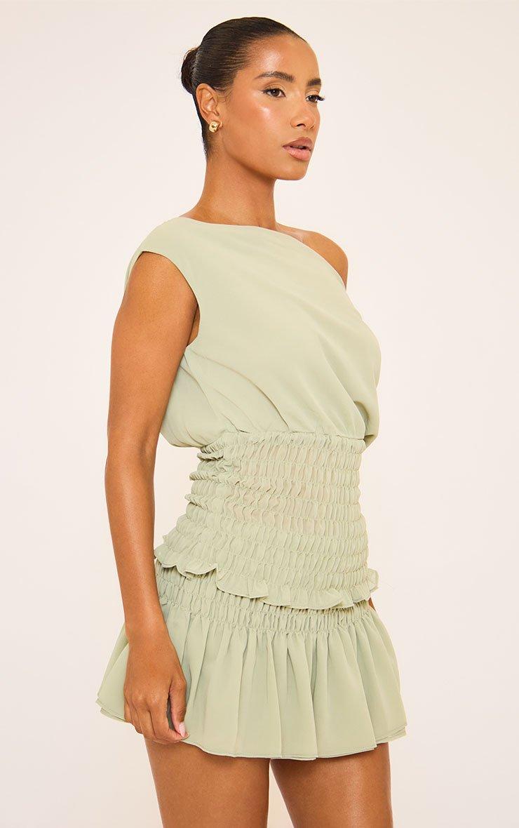 Off The Shoulder Shirred Waist Detail Asymmetric Top In Khaki Green
