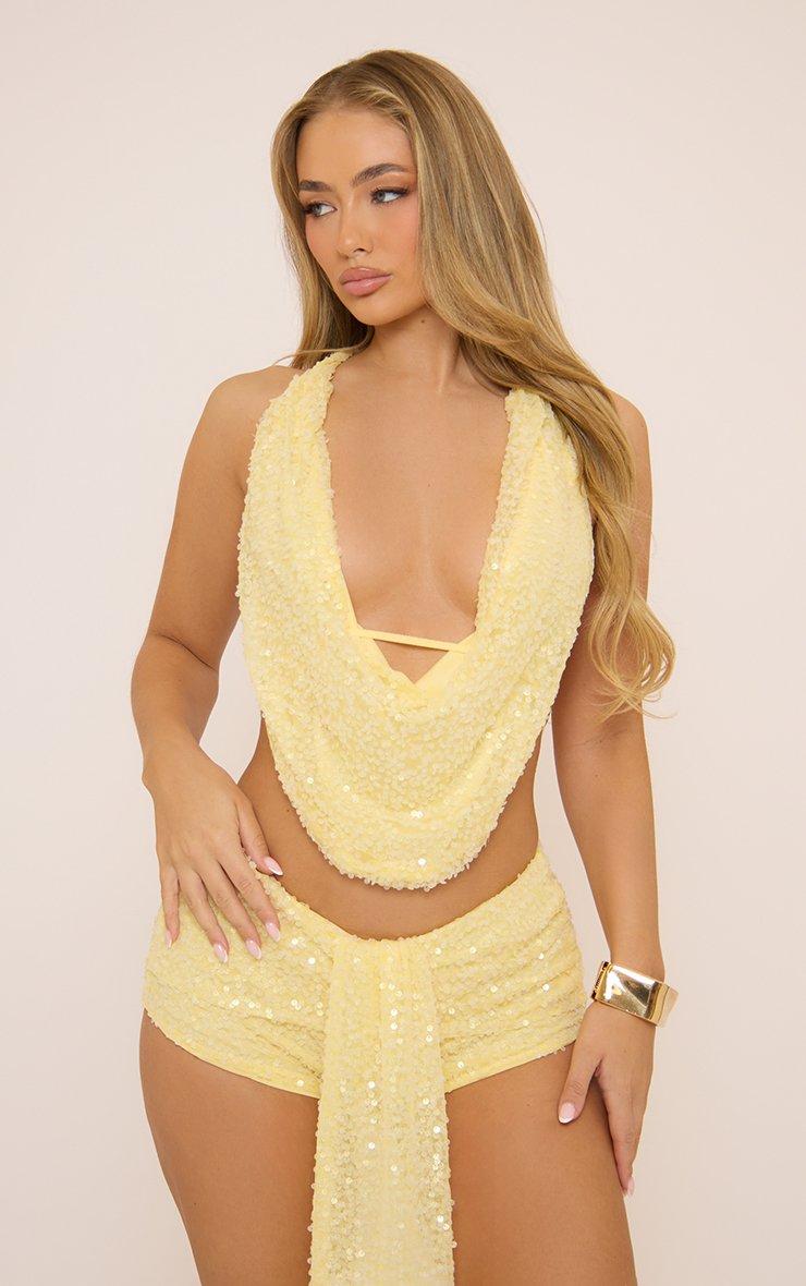 Low Rise Drape Front Detail Hot Pants In Yellow Sequin