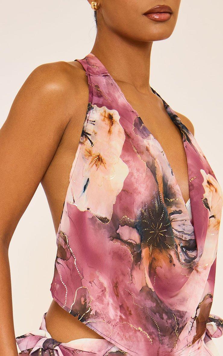 Cowl Halterneck Embellished Detail Top In Multi Abstract Print