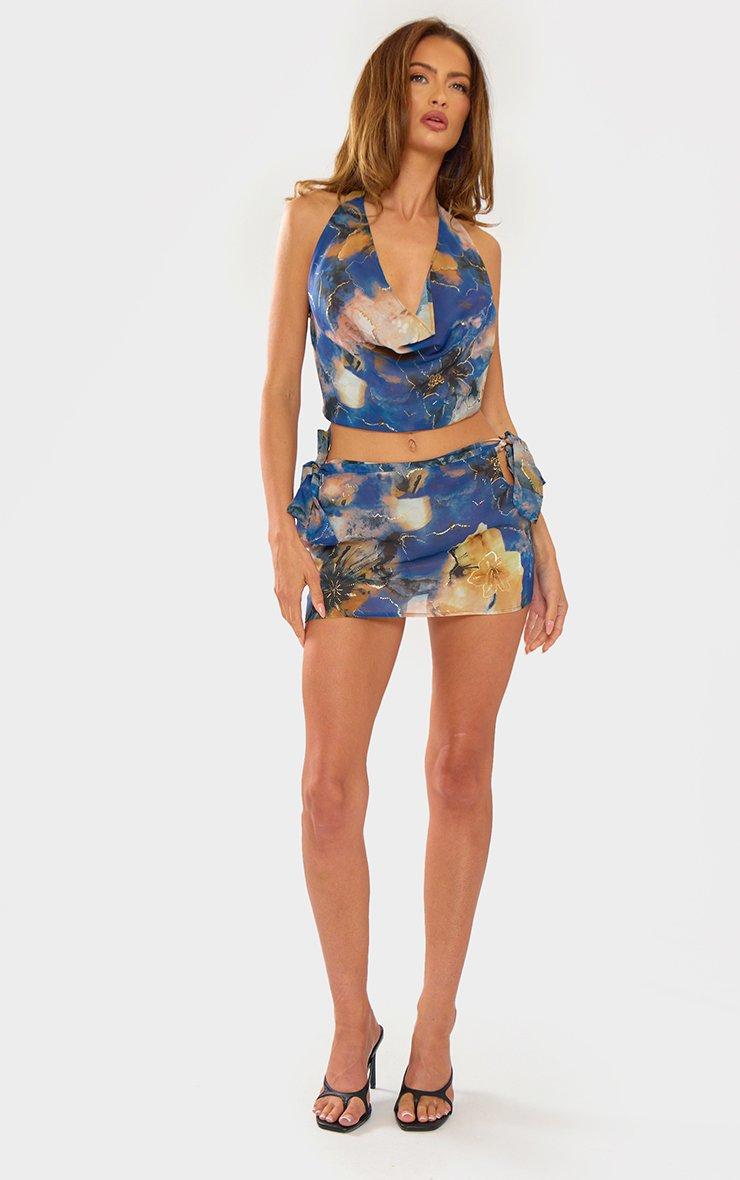 Mid Rise Embellished Tie Side Detail Mini Skirt In Blue Abstract Print