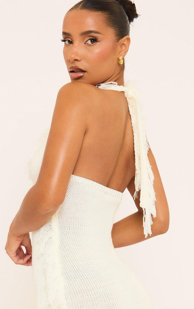 Halterneck Tassel Detail Fitted Mini Dress In White Knit